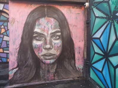 The artwork is of type graffiti. You can admire it in the city of London in United Kingdom, more precisely here: 7-5 Buck St, London NW1 8NJ, UK.