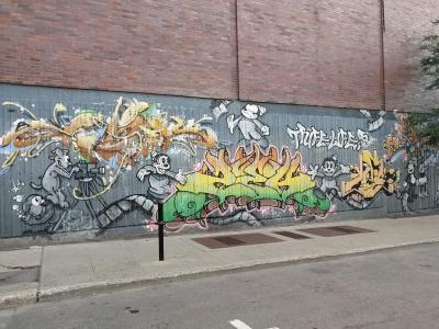 L'oeuvre est de type graffiti. Vous pouvez l'admirer dans la ville de Montréal en Canada et plus précisément ici : 830 Rue Sainte-Catherine E, Montréal, QC H2L 2E2, Canada.