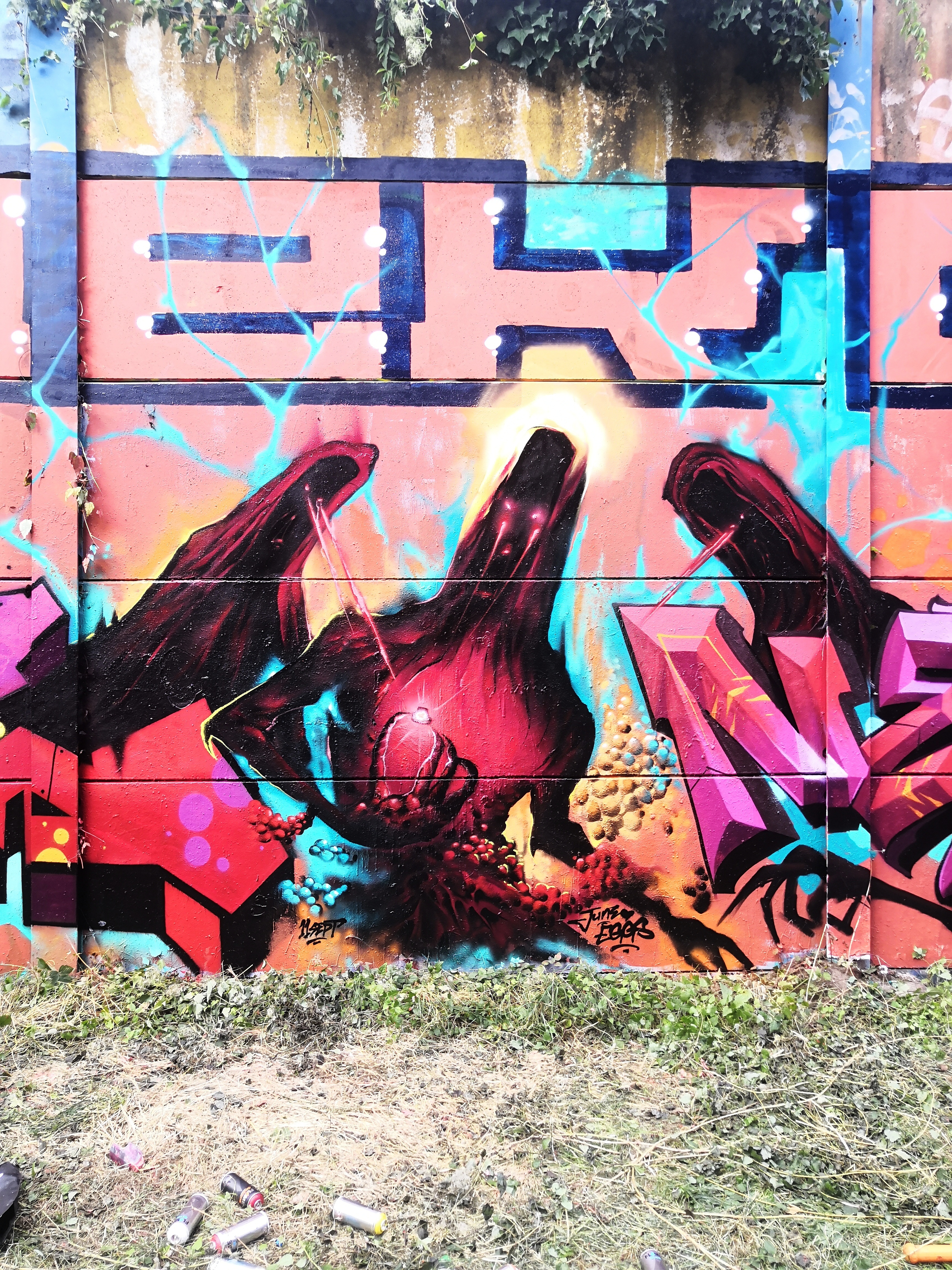 L'oeuvre est de type graffiti. Vous pouvez l'admirer dans la ville de Cergy en France et plus précisément ici : 33 Bd du Port, 95000 Cergy, France.