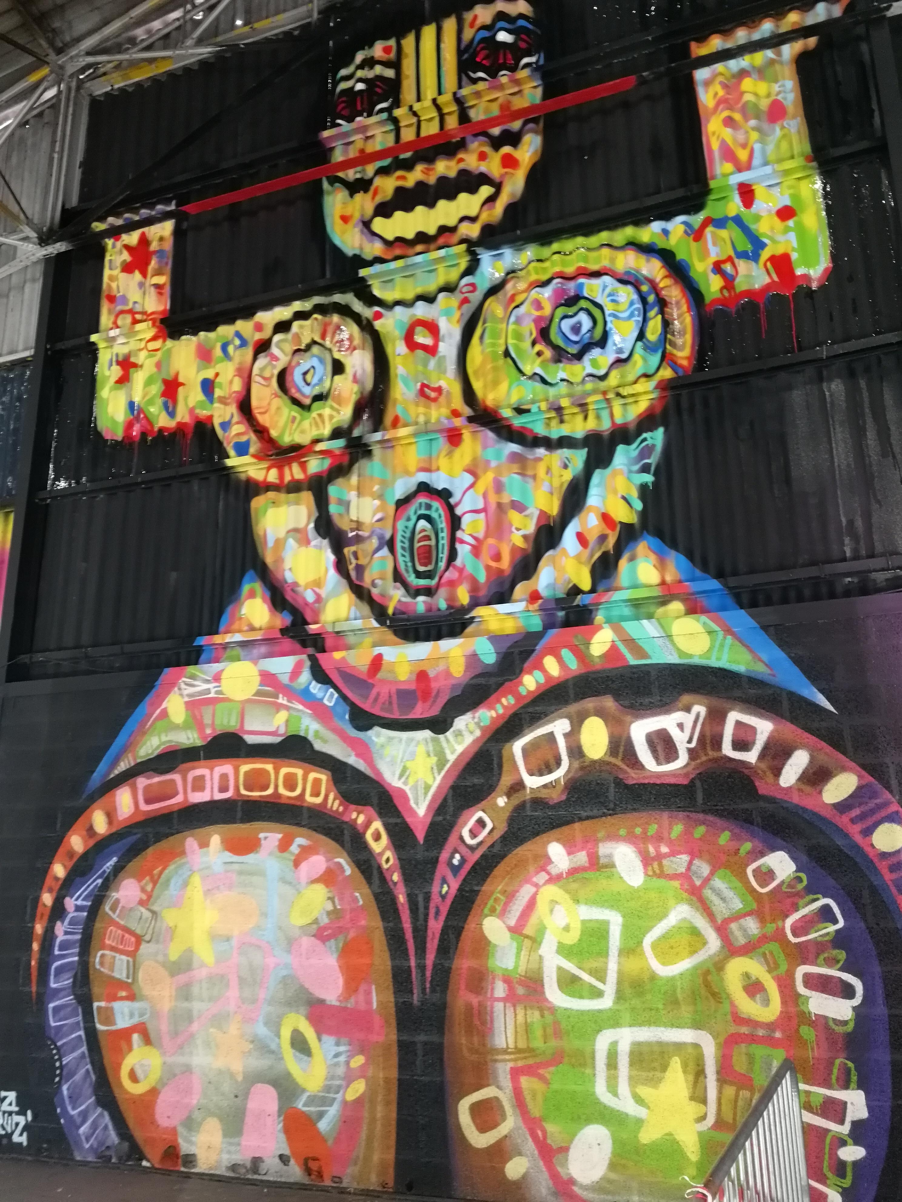 avoir peint des masques colorés sur de nombreux murs (les masques des