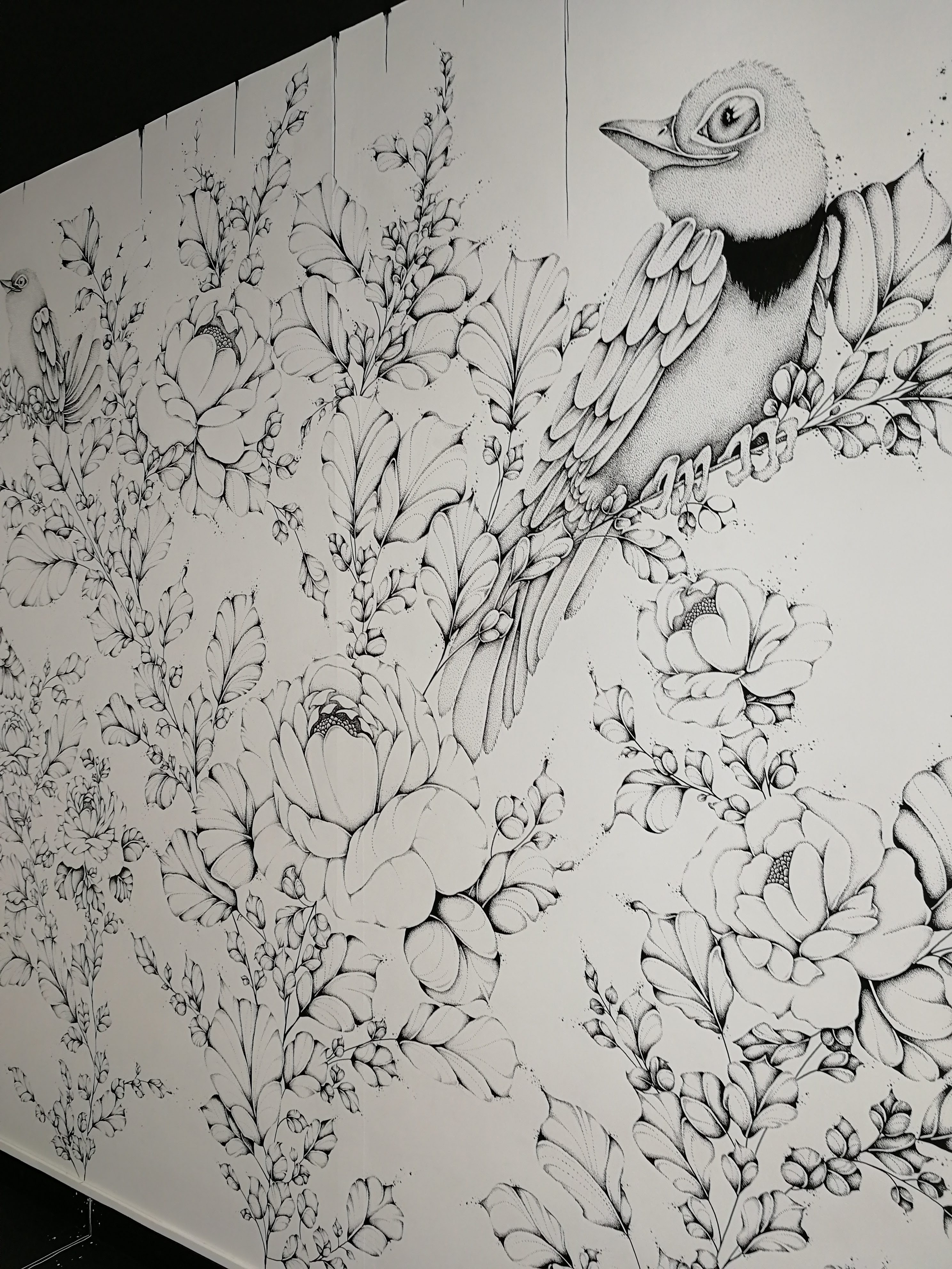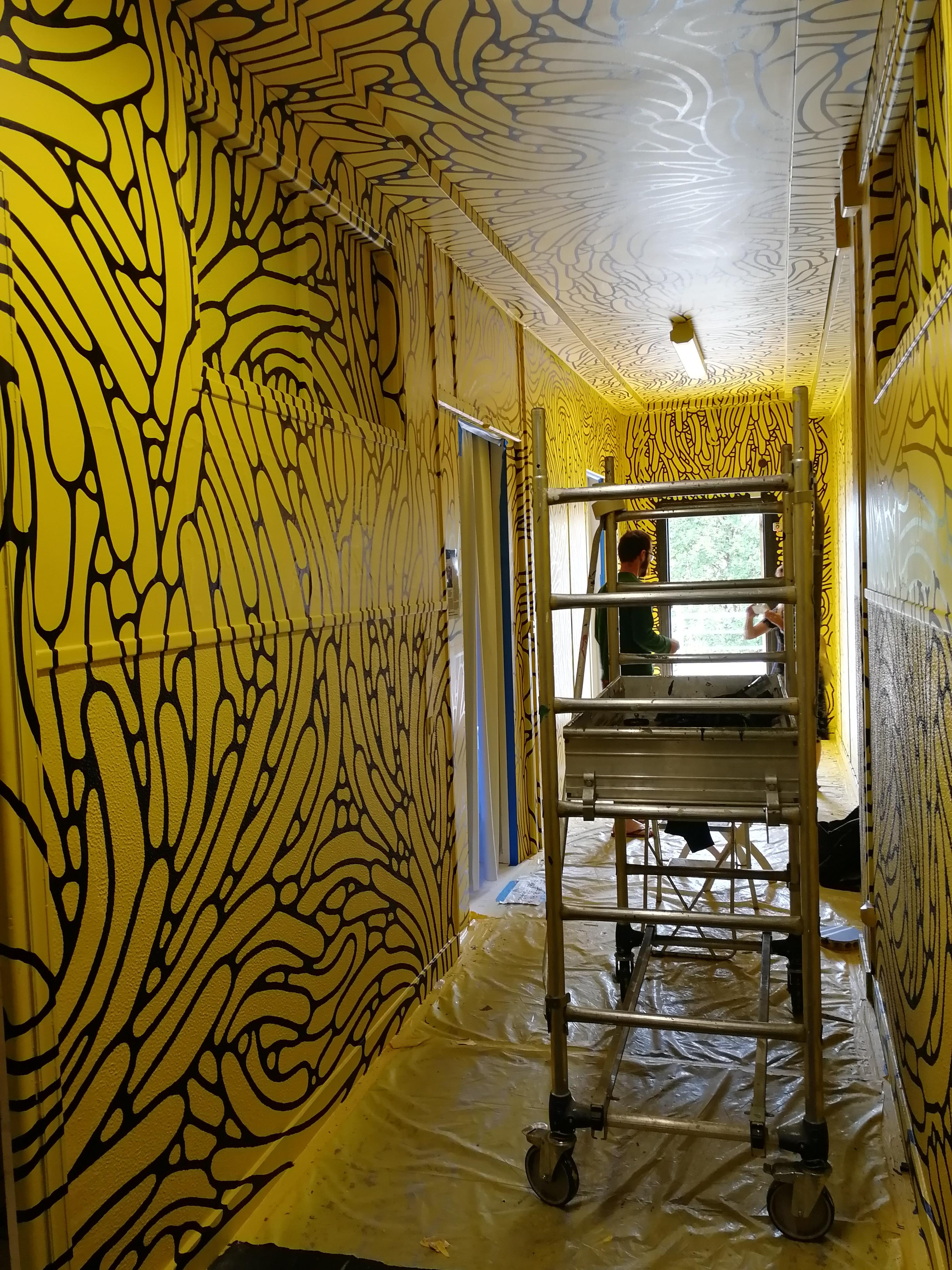 Martin Bineau était encore en plein travail pour finaliser son oeuvre monumentale de 160m2. Il lui aura fallut plus d'un mois de travail pour venir à bout du long couloir. Une fois le pied posé à l'intérieur, nous serons happés dans un tourbillon par les courbes noires intenses tracées au pinceau sur un fond jaune d'or.