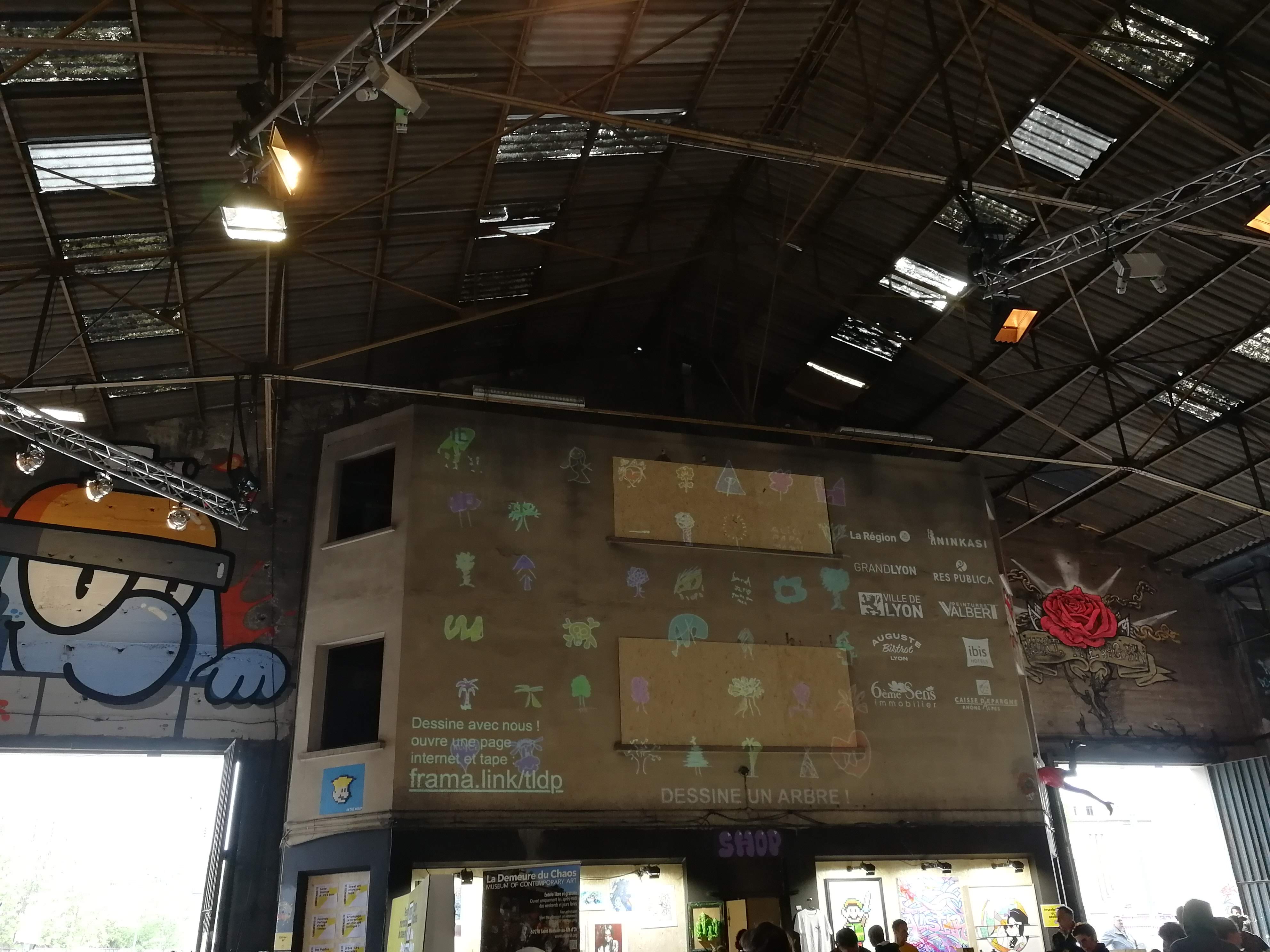 Pour cet atelier, le public était invité à dessiner sur son smartphone et le dessin était alors projeté en direct sur les murs de la Halle Debourg, formant ainsi un tableau collaboratif.