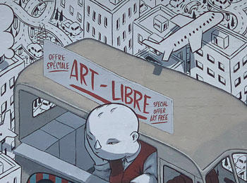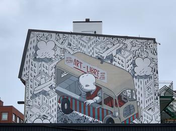Italian artist Francesco Camillo Giorgino, known as Millo, paints large-scale murals that feature friendly inhabitants exploring their urban setting. He uses simple black and white lines with dashes of color when necessary, and often incorporates elements of architecture into his multi-story paintings.