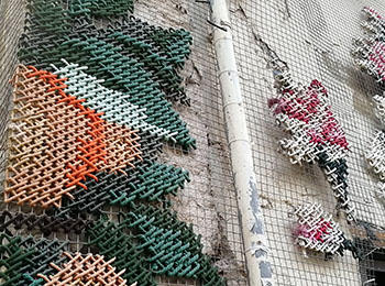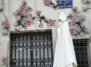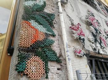 Spanish scenographer and artist, Raquel Rodrigo likes to combine fashion and architecture, through a reflection on materials and techniques. Thus, she incorporates macro cross stitch details on the facades of Madrid buildings.