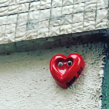 Moulages en forme de cœur agrémentés d'un visage reconnaissable. Collages à paris et banlieue, l'artiste vient de Ménilmontant.