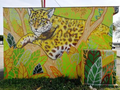 The artwork is of type graffiti. You can admire it in the city of Saint-Nazaire in France, more precisely here: 14 Place de la Rampe, 44600 Saint-Nazaire, France.