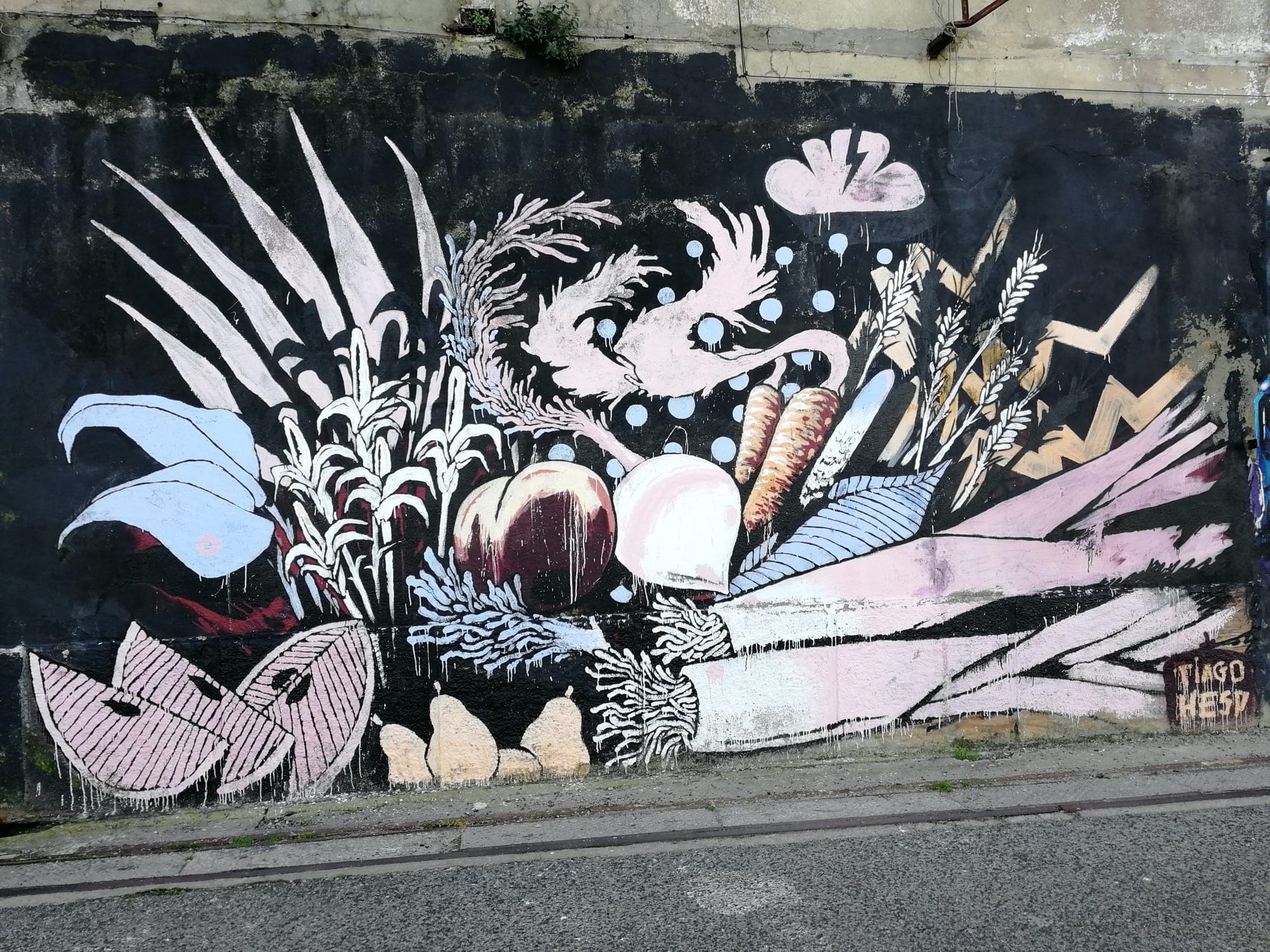 The artwork is of graffiti type. You can admire it in the city of Almada in Portugal and more precisely here : R. do Ginjal 27, 2800 Almada, Portugal.