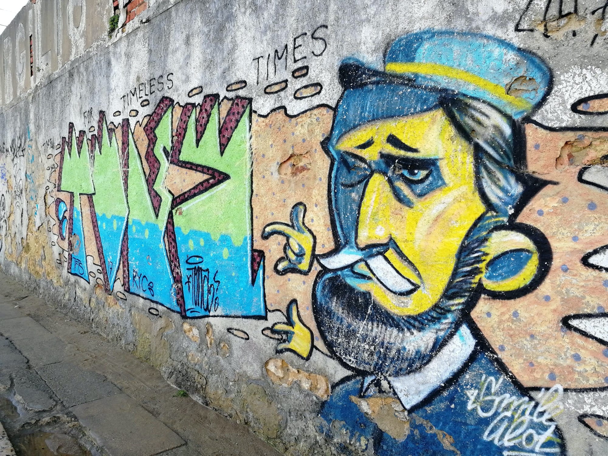 The artwork is of graffiti type. You can admire it in the city of Lisboa in Portugal and more precisely here : R. Gen. Gomes Araújo, 1350 Lisboa, Portugal.