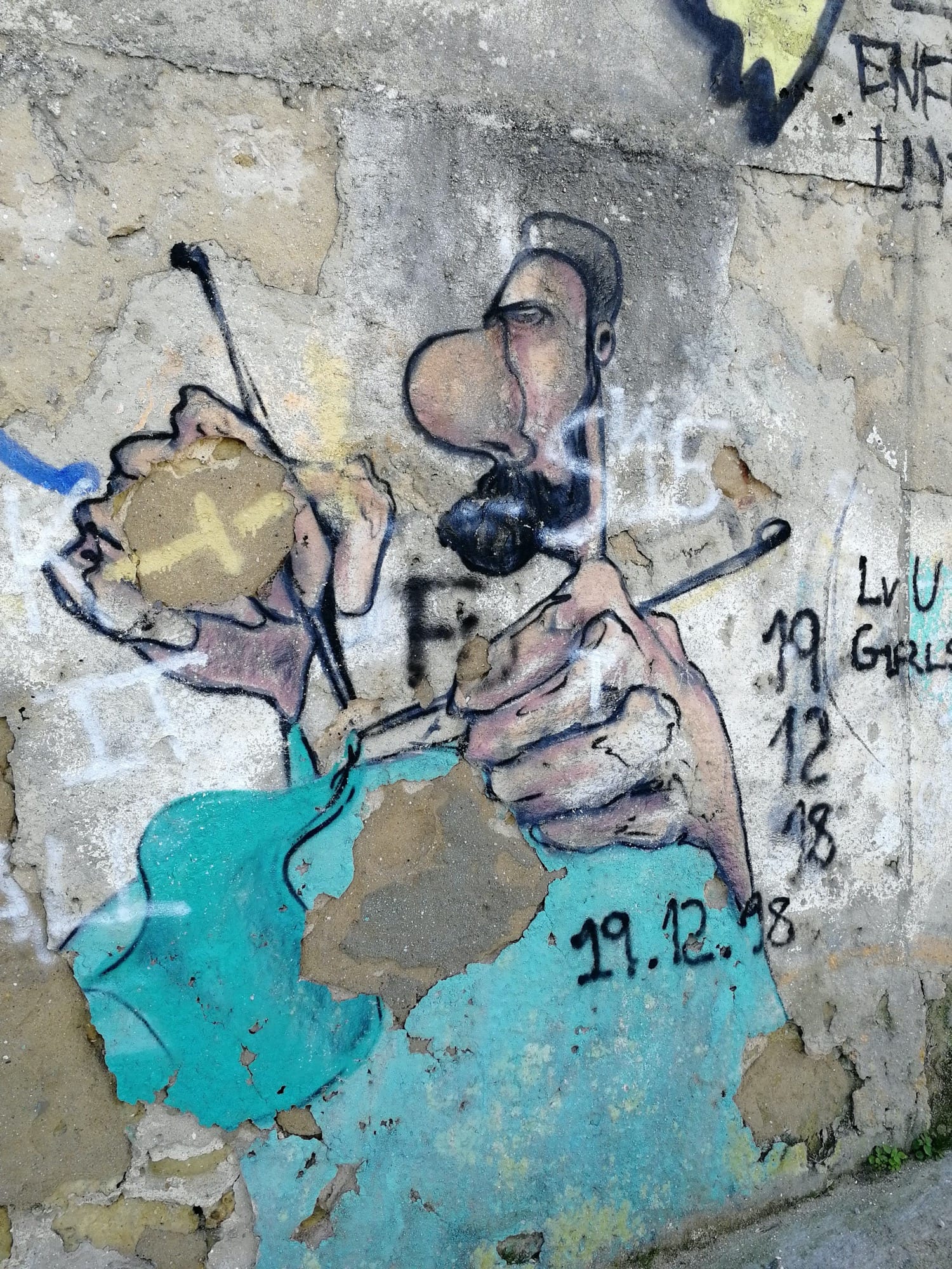 The artwork is of graffiti type. You can admire it in the city of Almada in Portugal and more precisely here : R. do Ginjal 67, 2800 Almada, Portugal.