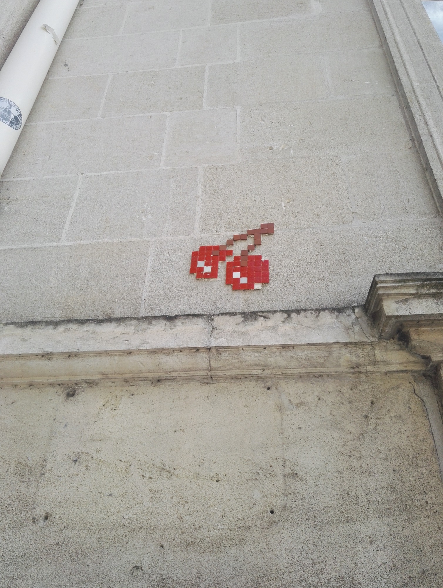 The artwork Cerises is of mosaic type. You can admire it in the city of Nantes in France and more precisely here : 1 Place de la Bourse, 44000 Nantes, France.