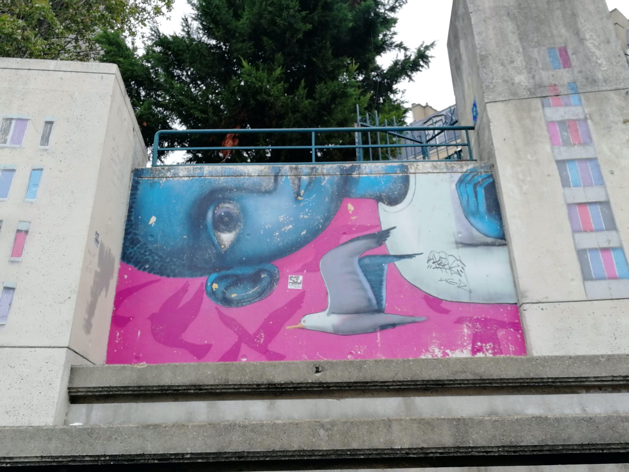 The artwork is of graffiti type. You can admire it in the city of Paris in France and more precisely here : 27 Rue Piat, 75020 Paris, France.
