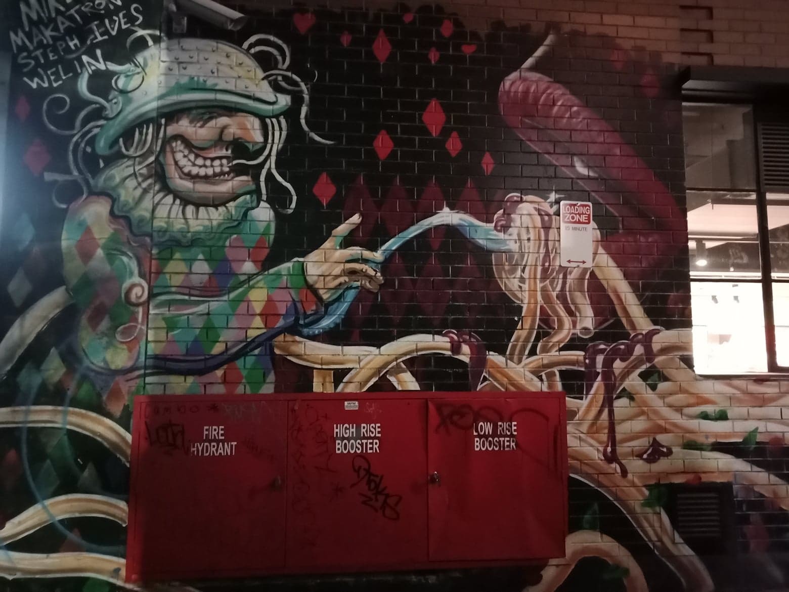 The artwork Jester is of graffiti type. You can admire it in the city of Melbourne in Australia and more precisely here : 168 Exhibition St, Melbourne VIC 3000, Australia.