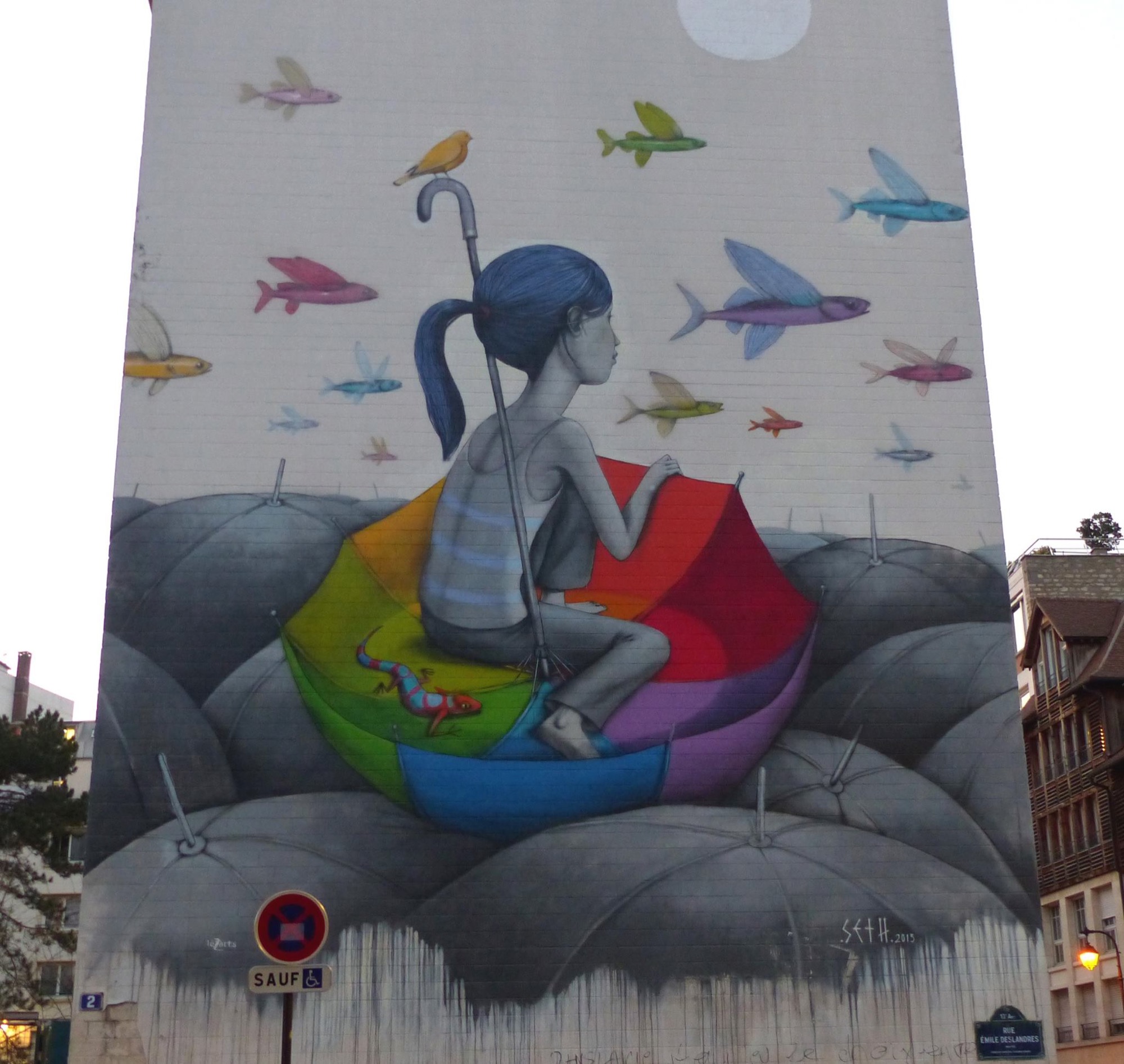 The artwork is of graffiti type. You can admire it in the city of Paris in France and more precisely here : 12 Rue Berbier du Mets, 75013 Paris, France.