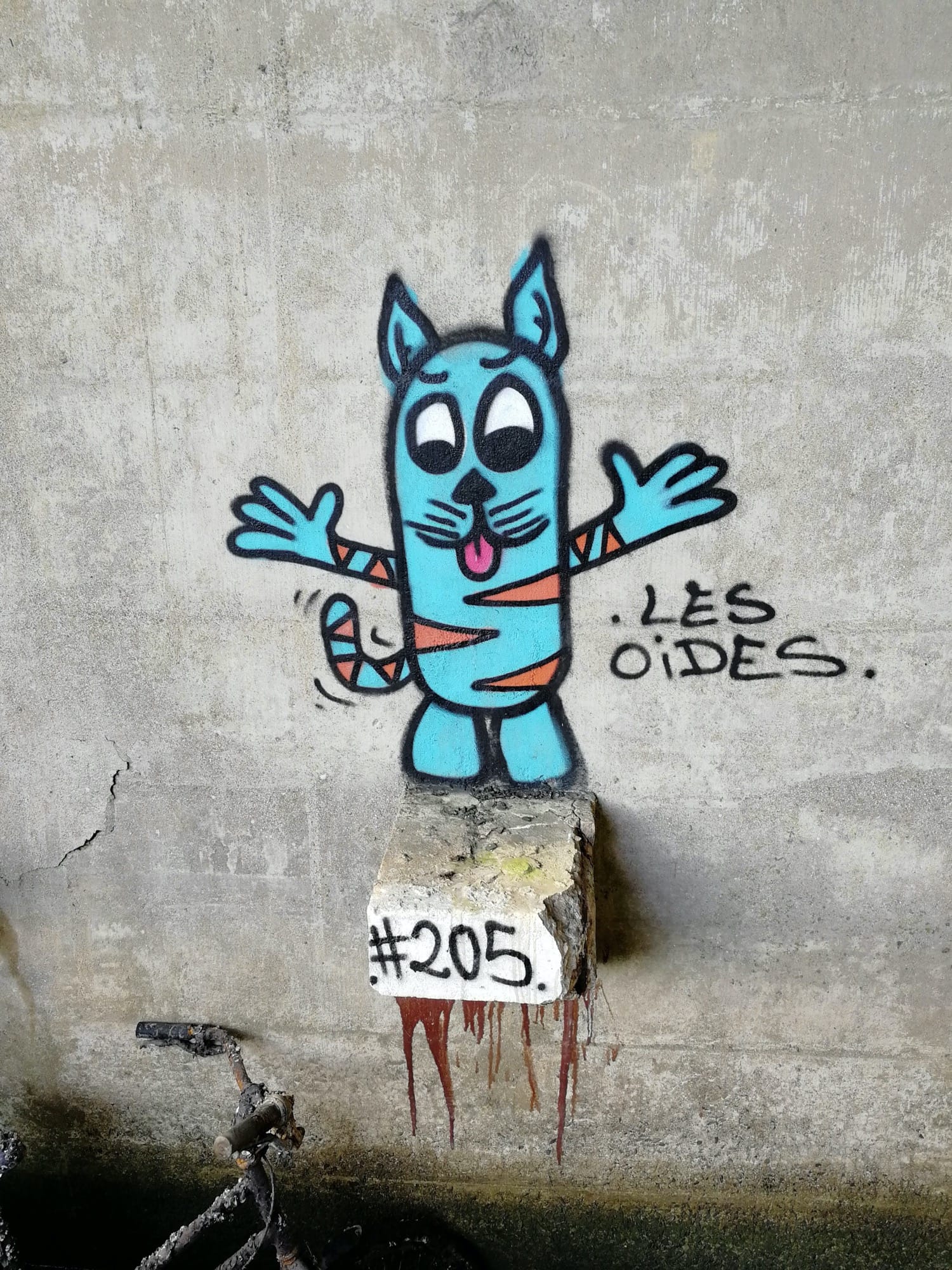 The artwork Les oides #205 is of graffiti type. You can admire it in the city of Montoir-de-Bretagne in France and more precisely here : Pont de Méan, 11 Rue Henri Gautier, 44550 Montoir-de-Bretagne, France.