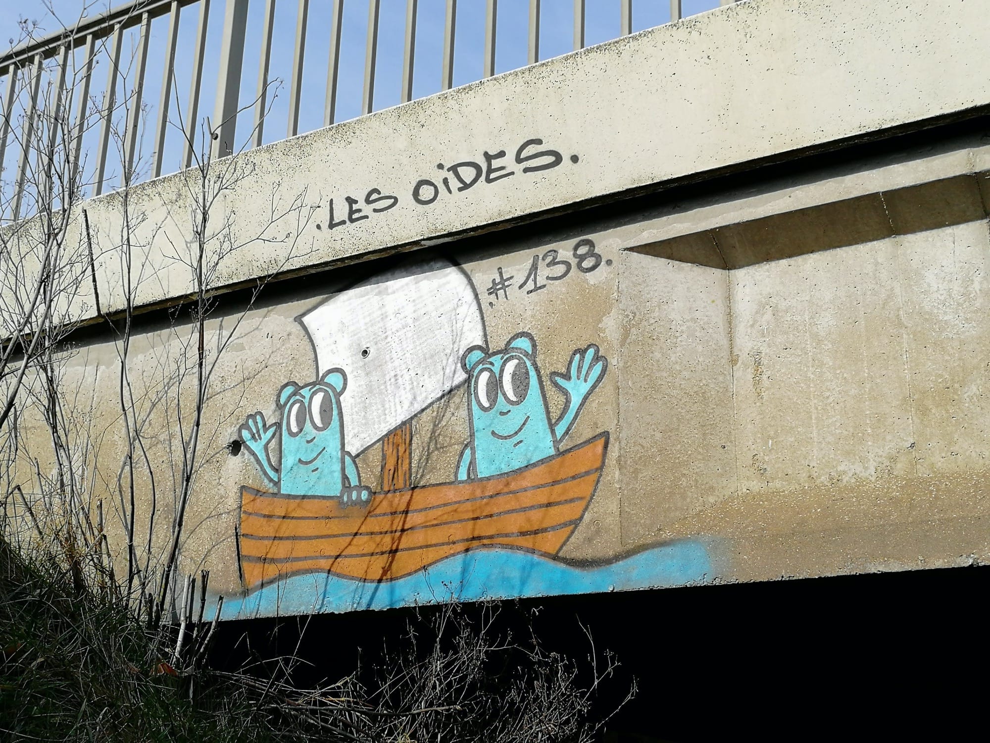 The artwork Les oides #138 is of graffiti type. You can admire it in the city of Saint-Nazaire in France and more precisely here : 217 Rue de Trignac, 44600 Saint-Nazaire, France.