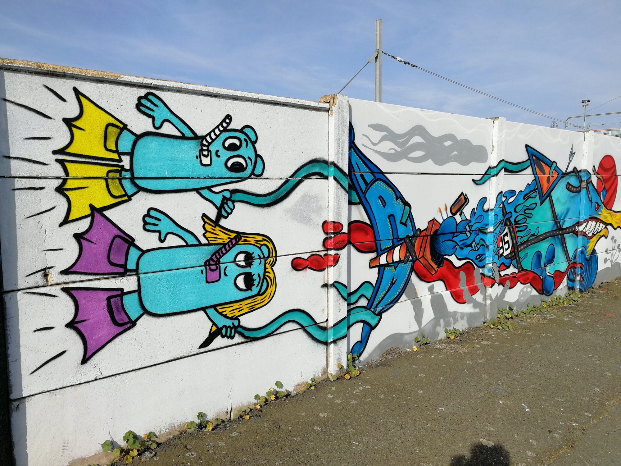 The artwork is of graffiti type. You can admire it in the city of Saint-Nazaire in France and more precisely here : 308 Boulevard Paul Leferme, 44600 Saint-Nazaire, France.