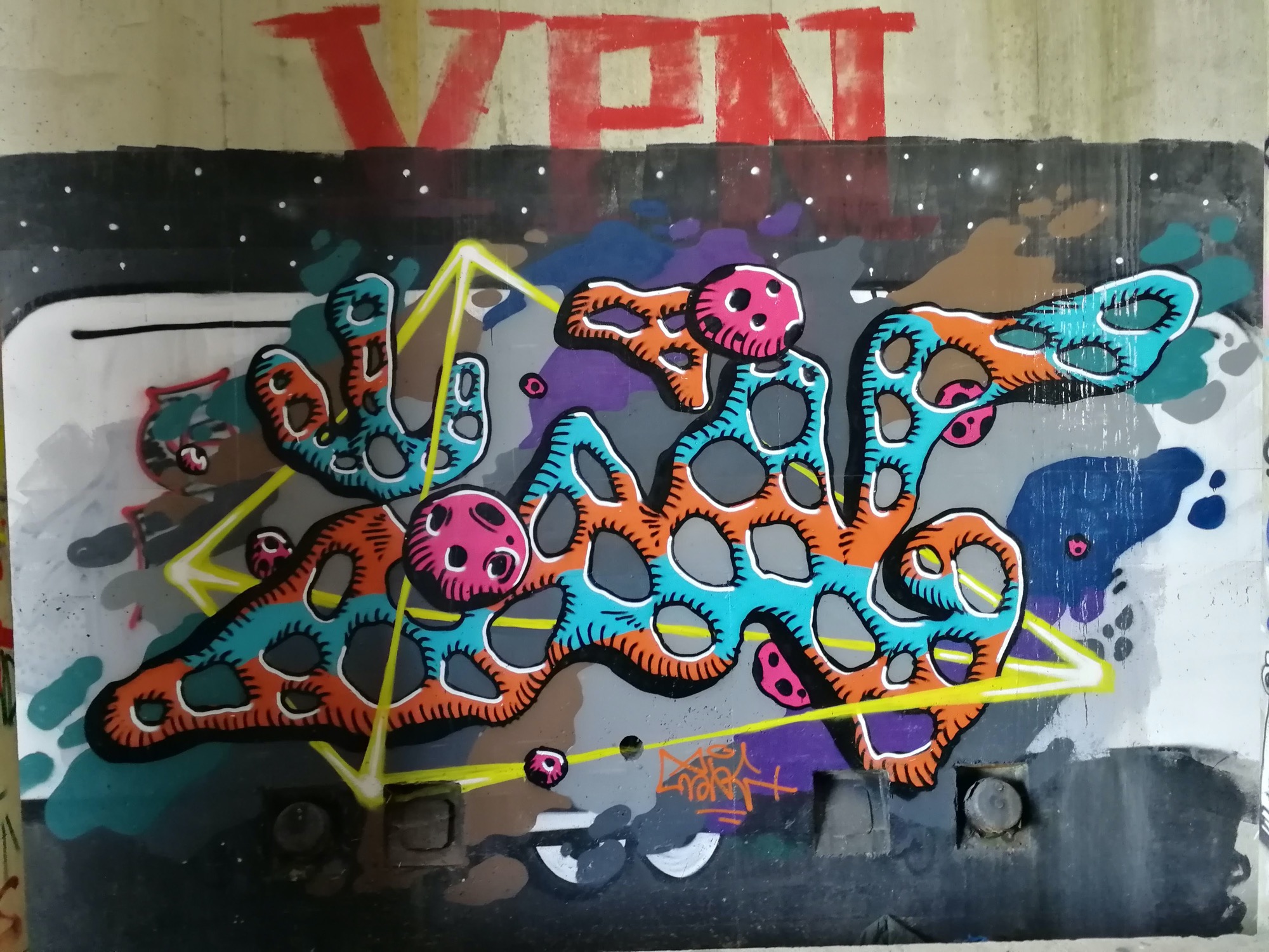 The artwork is of graffiti type. You can admire it in the city of Angers in France and more precisely here : A11, 49100 Angers, France.