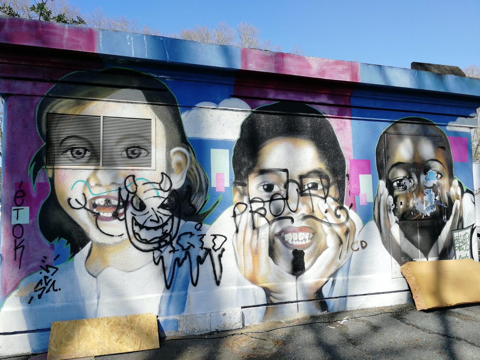 The artwork is of graffiti type. You can admire it in the city of Angers in France and more precisely here : 2 Rue Godard Faultrier, 49100 Angers, France.