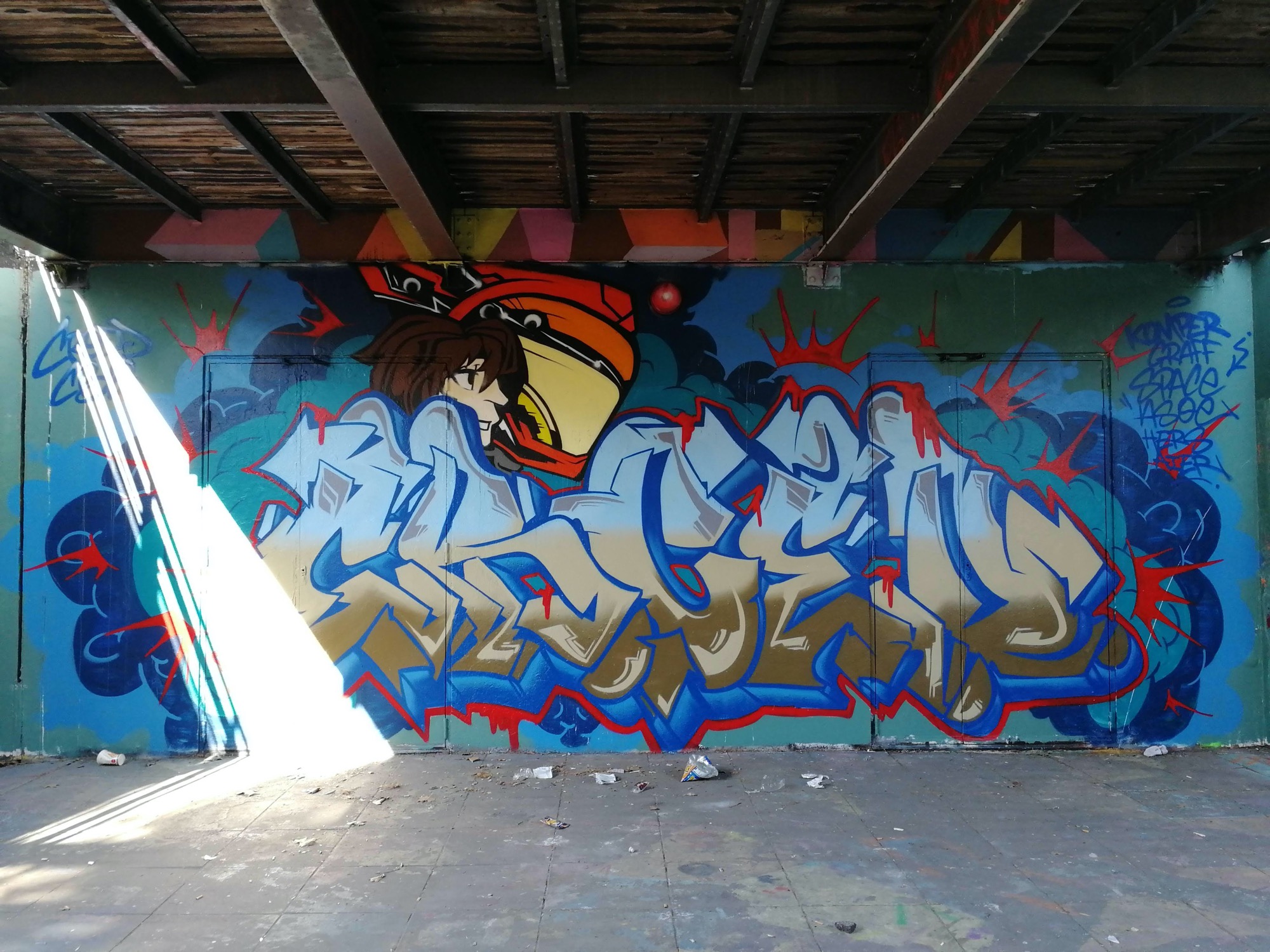The artwork is of graffiti type. You can admire it in the city of Angers in France and more precisely here : 7 Allée François Mitterrand, 49100 Angers, France.