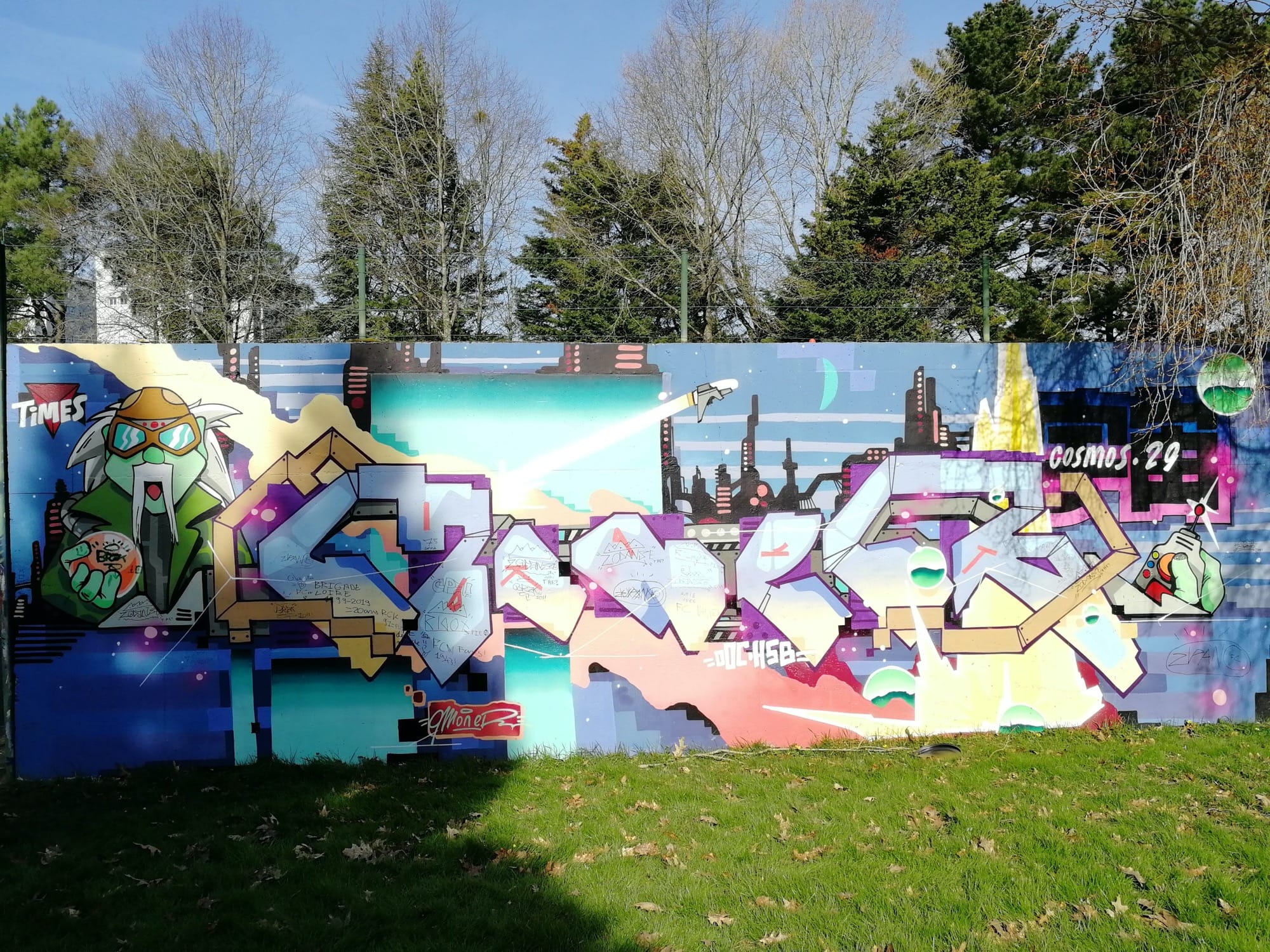 The artwork is of graffiti type. You can admire it in the city of Nantes in France and more precisely here : 73 Rue du Port Boyer, 44300 Nantes, France.