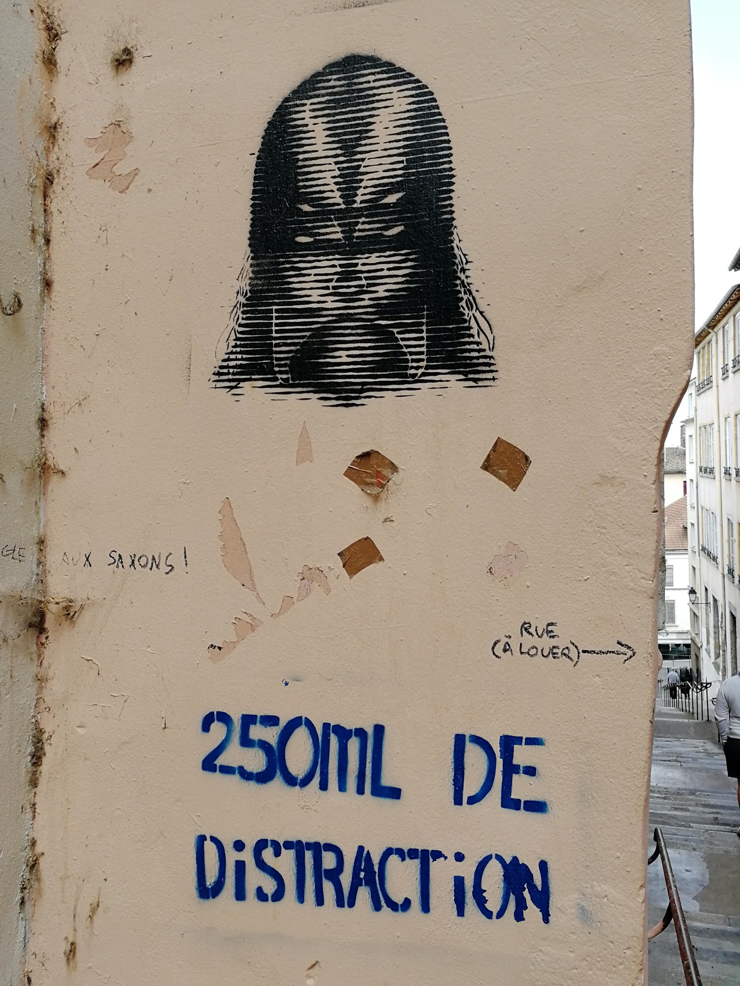 The artwork 250ml de distraction is of graffiti type. You can admire it in the city of Lyon in France and more precisely here : Gare Saint Paul, 69005 Lyon, France.