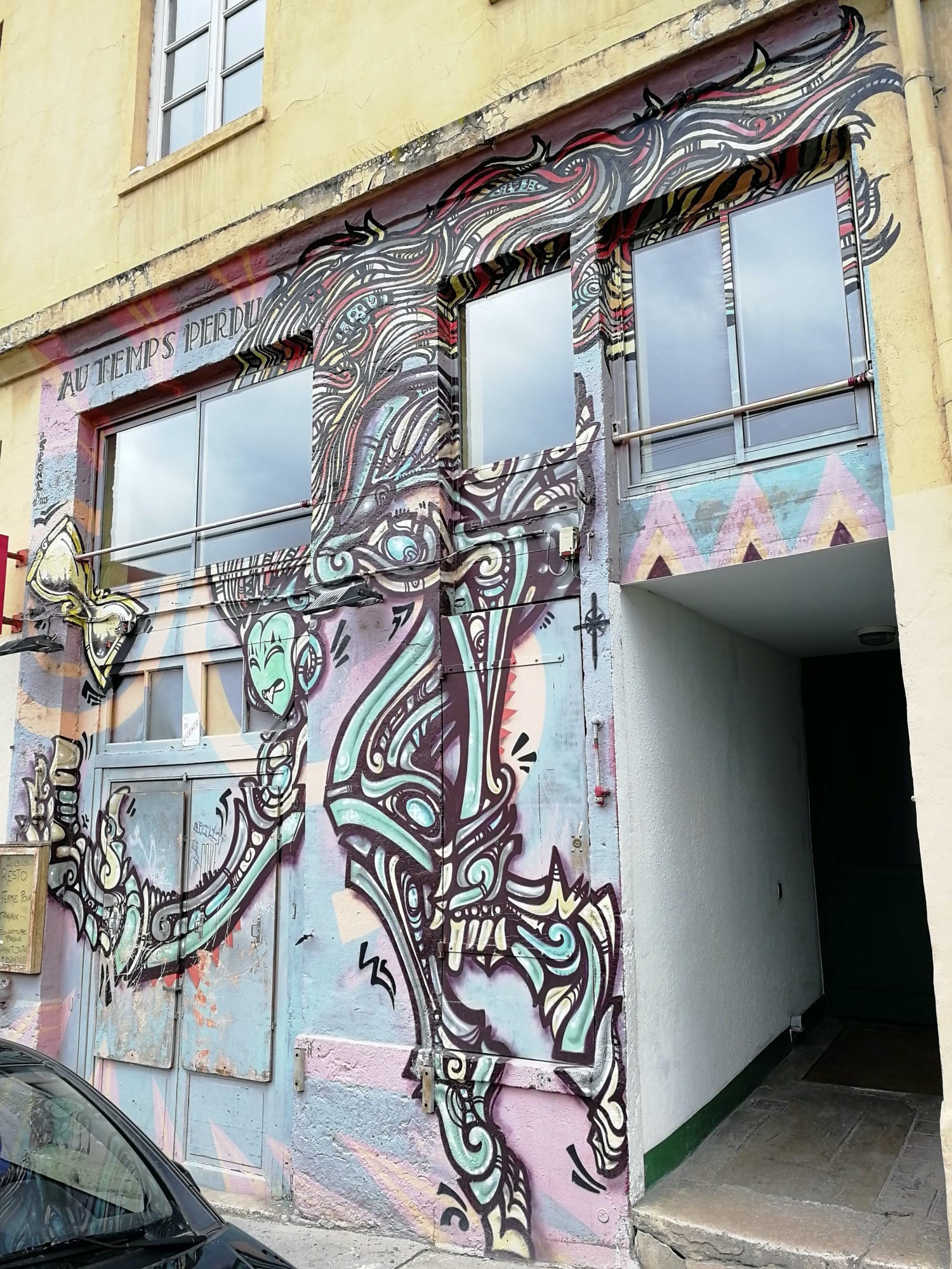 The artwork Au temps perdu is of graffiti type. You can admire it in the city of Lyon in France and more precisely here : 2 Rue des Fantasques, 69001 Lyon, France.
