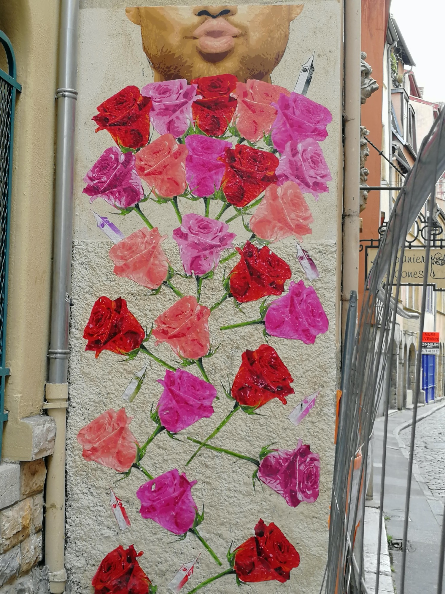 The artwork is of graffiti type. You can admire it in the city of Lyon in France and more precisely here : 12 Rue Saint-Georges, 69005 Lyon, France.