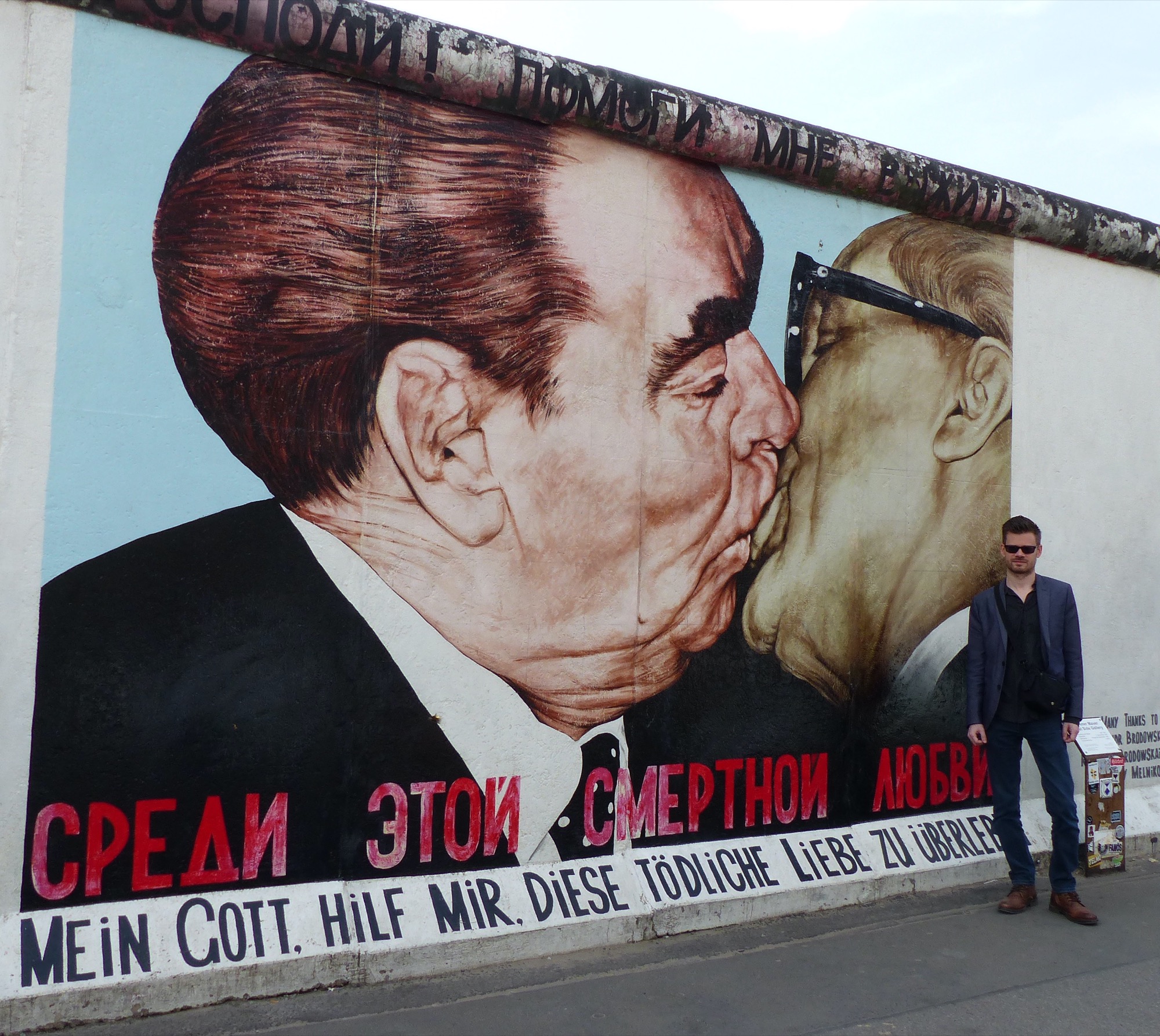The artwork Baiser fraternel socialiste is of graffiti type. You can admire it in the city of Berlin in Germany and more precisely here : Mühlenstraße 76, 10243 Berlin, Germany.