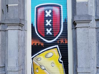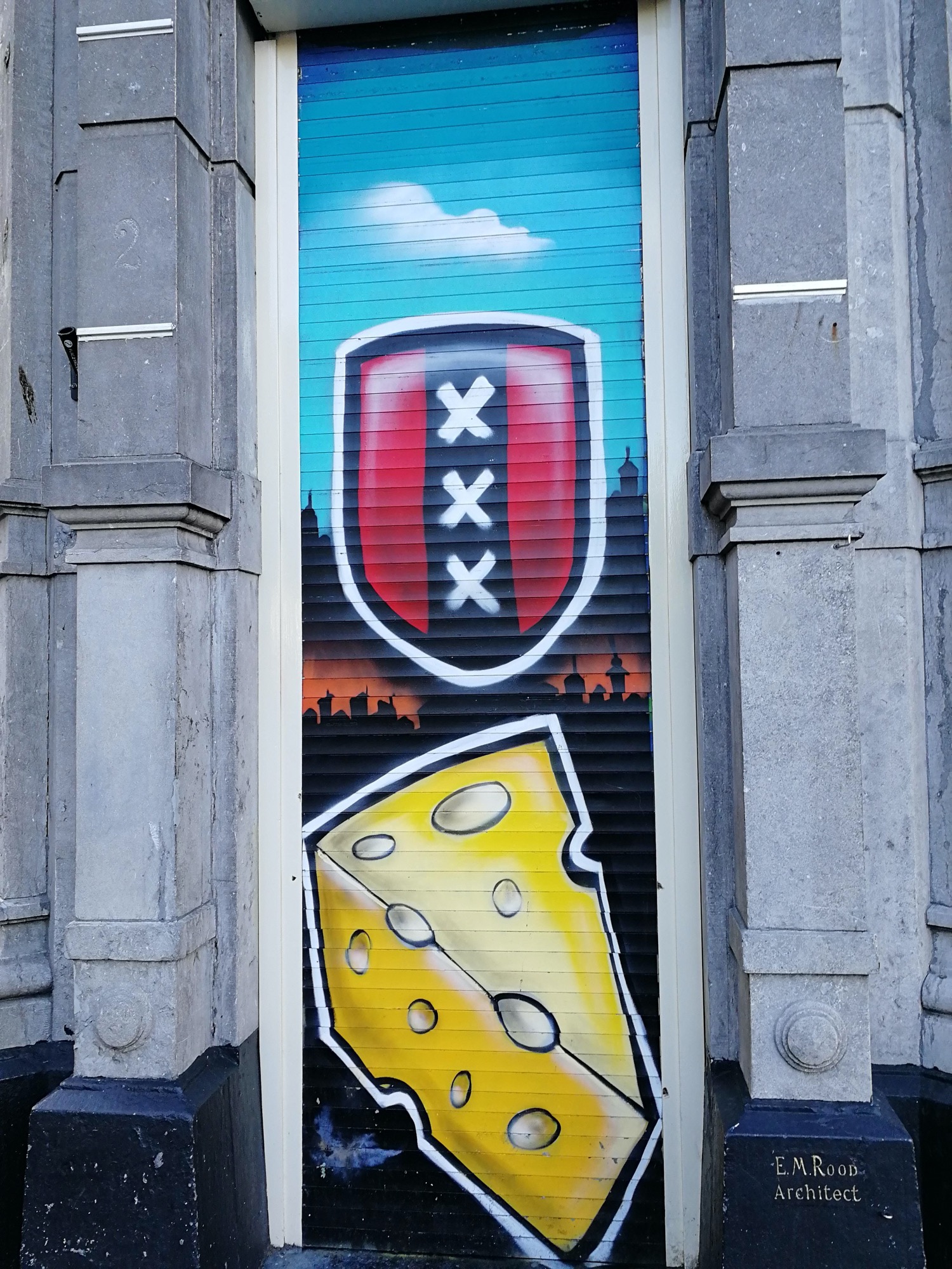 The artwork Amsterdam cheese is of graffiti type. You can admire it in the city of Amsterdam in Netherlands and more precisely here : Singel 8, 1013 GA Amsterdam, Pays-Bas.