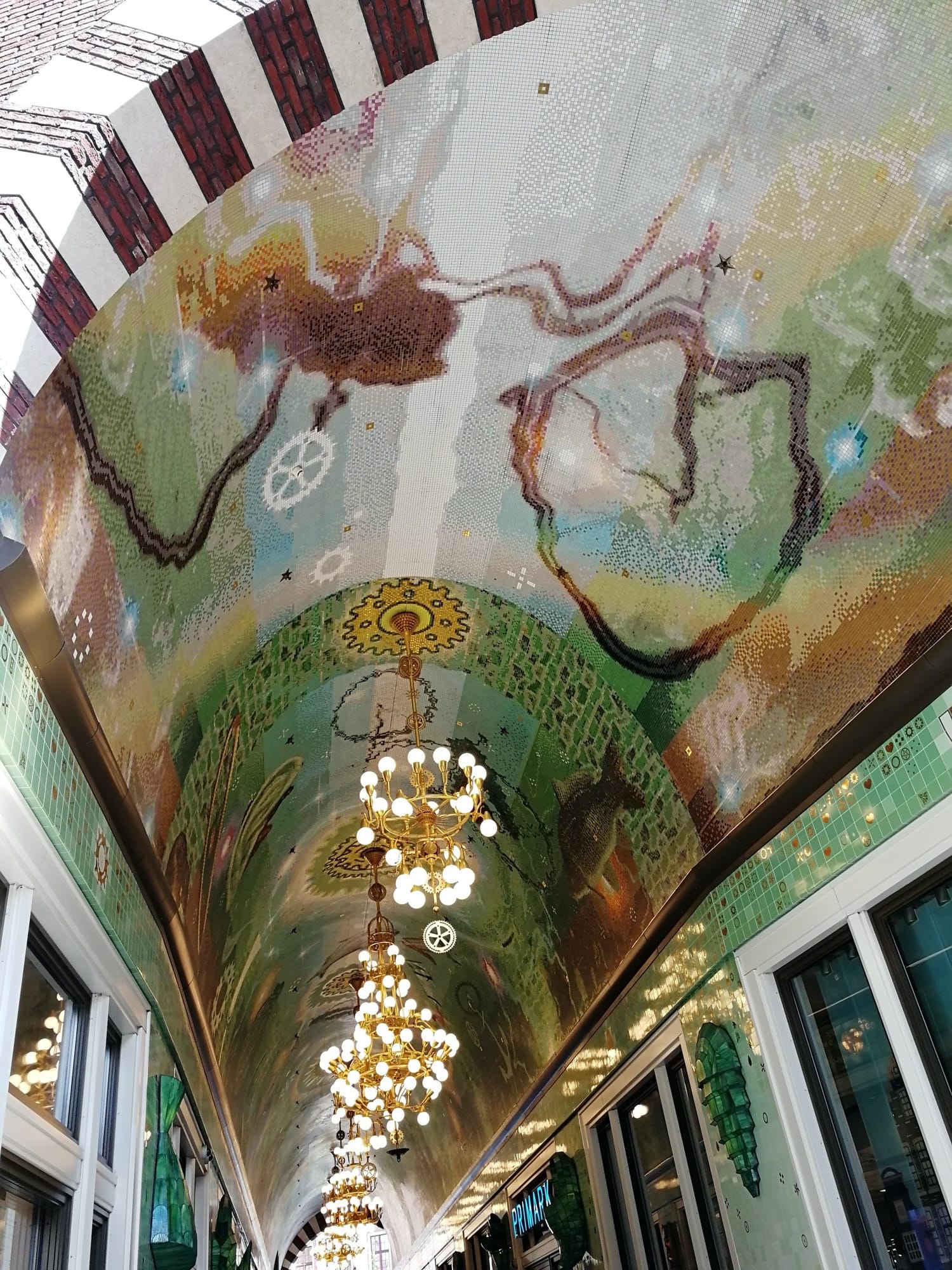 The artwork is of mosaic type. You can admire it in the city of Amsterdam in Netherlands and more precisely here : Nieuwendijk 189, 1012 MG Amsterdam, Pays-Bas.