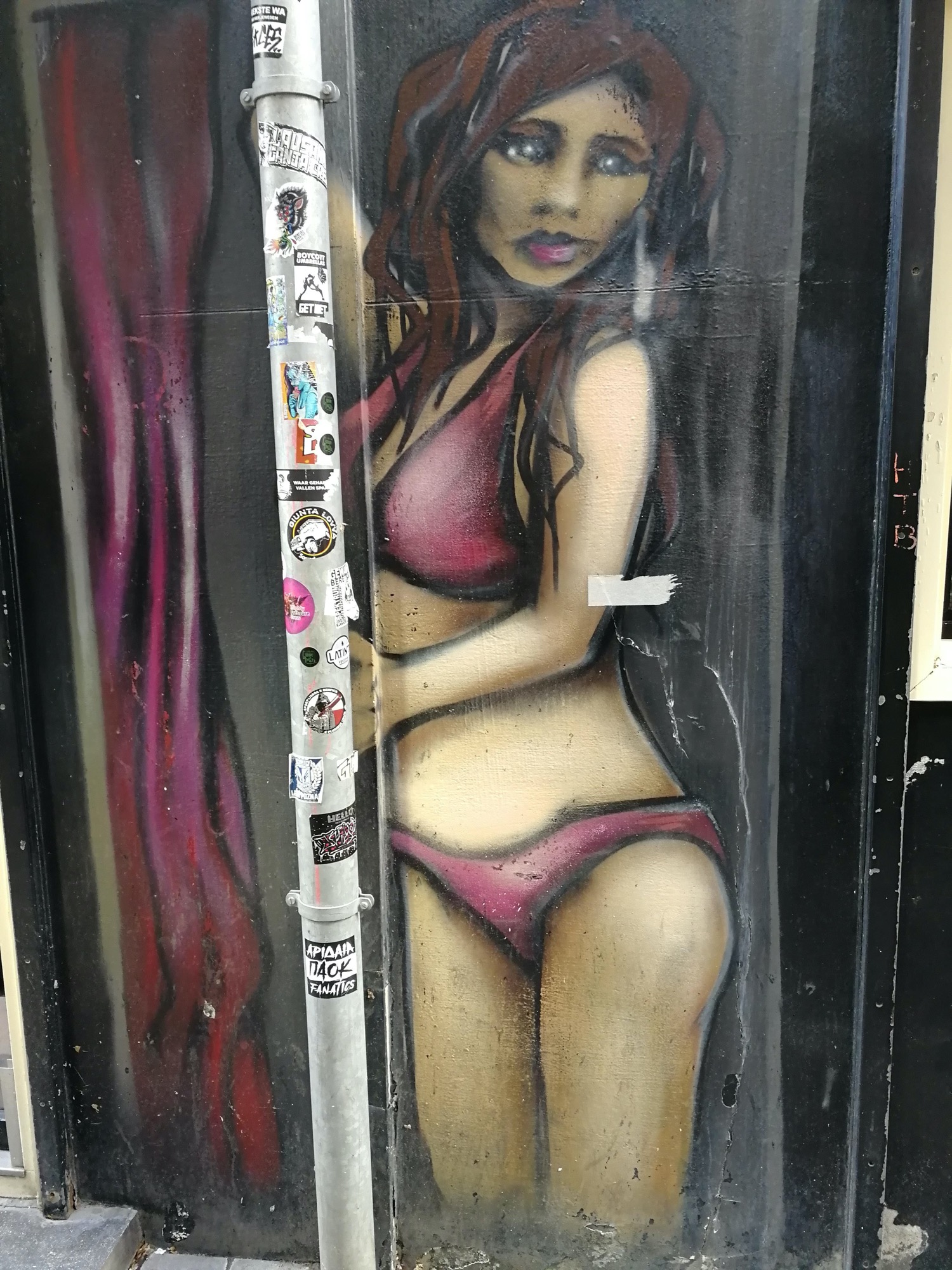The artwork is of graffiti type. You can admire it in the city of Amsterdam in Netherlands and more precisely here : Dollebegijnensteeg 7, 1012 HD Amsterdam, Pays-Bas.