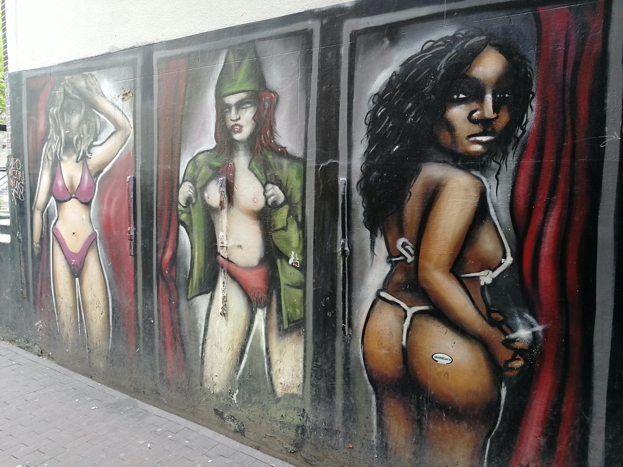 The artwork is of graffiti type. You can admire it in the city of Amsterdam in Netherlands and more precisely here : Oudezijds Voorburgwal 90, 1012 GG Amsterdam, Pays-Bas.