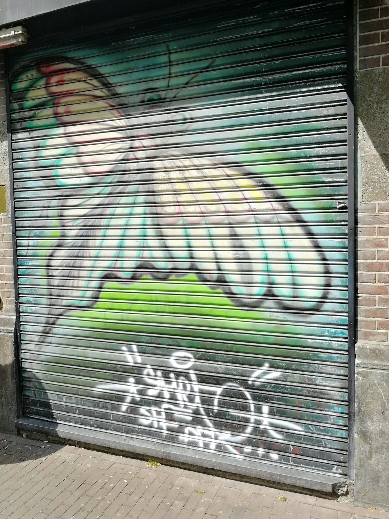 The artwork is of graffiti type. You can admire it in the city of Amsterdam in Netherlands and more precisely here : Oudezijds Voorburgwal 99AHS, 1012 EM Amsterdam, Pays-Bas.