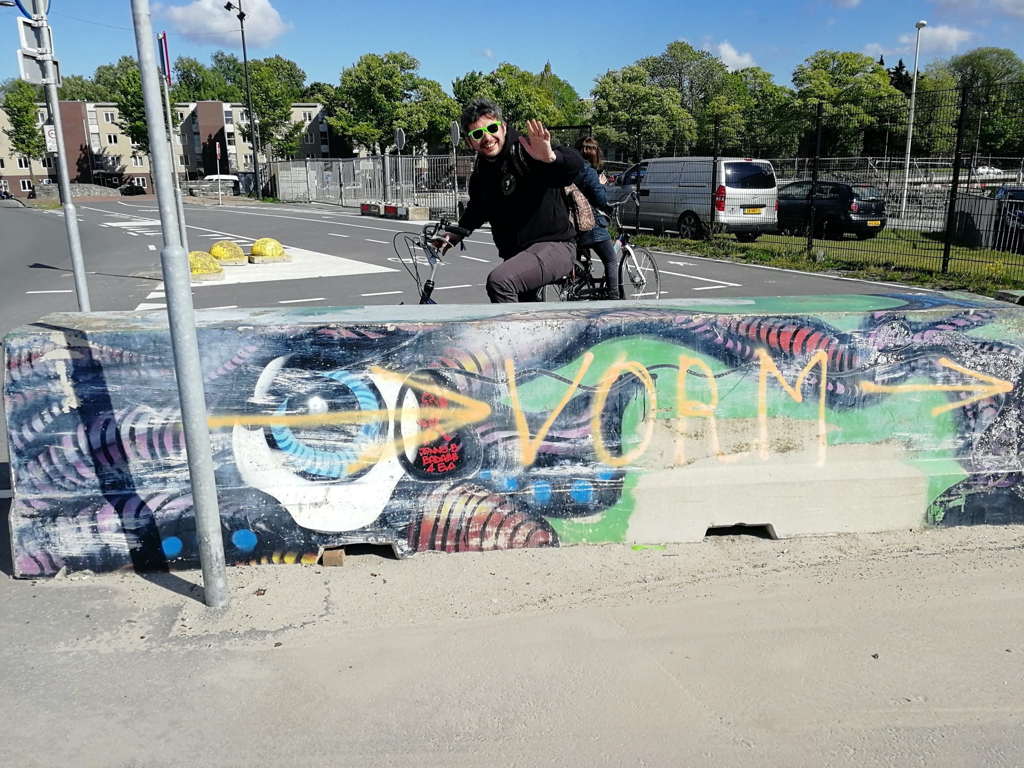 The artwork is of graffiti type. You can admire it in the city of Amsterdam in Netherlands and more precisely here : Ranonkelkade 1BHS, 1031 XR Amsterdam, Pays-Bas.