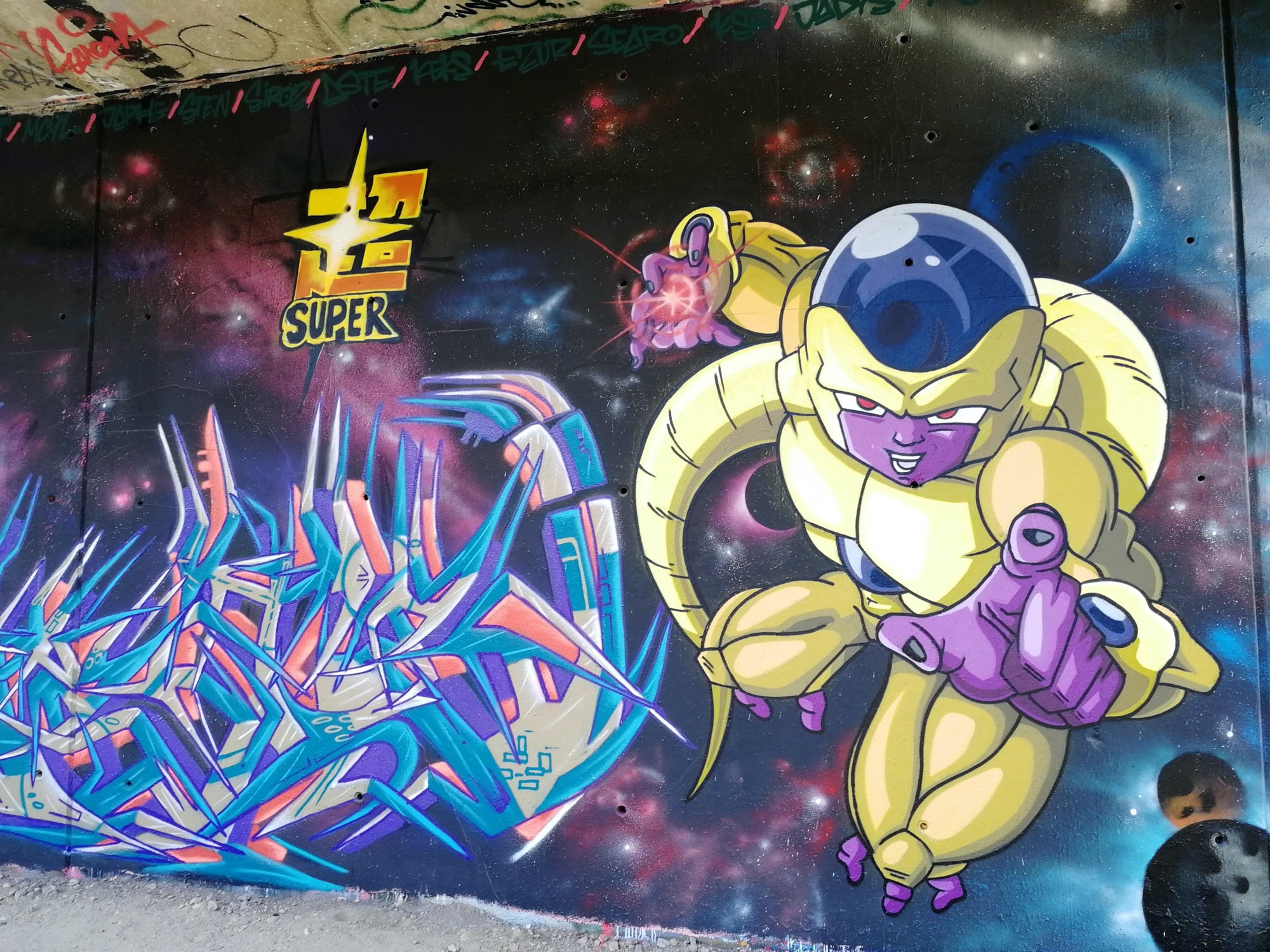 The artwork is of graffiti type. You can admire it in the city of Olivet in France and more precisely here : D2271 & D2020, 45160 Olivet, France.