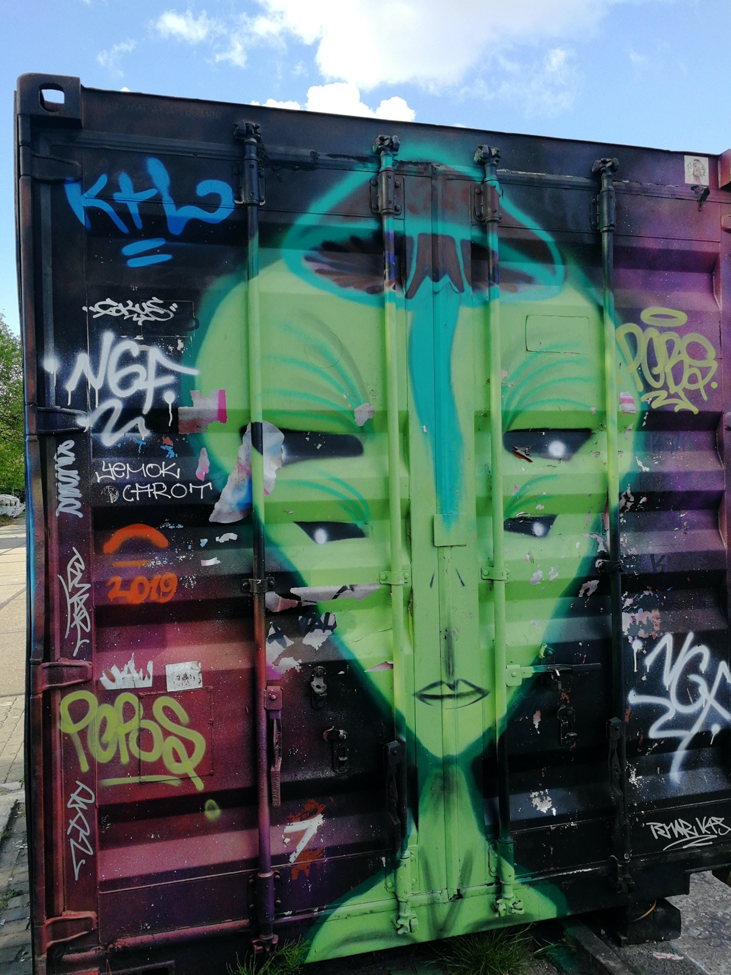 The artwork is of graffiti type. You can admire it in the city of Amsterdam in Netherlands and more precisely here : NDSM-Plein 78, 1033 WB Amsterdam, Pays-Bas.