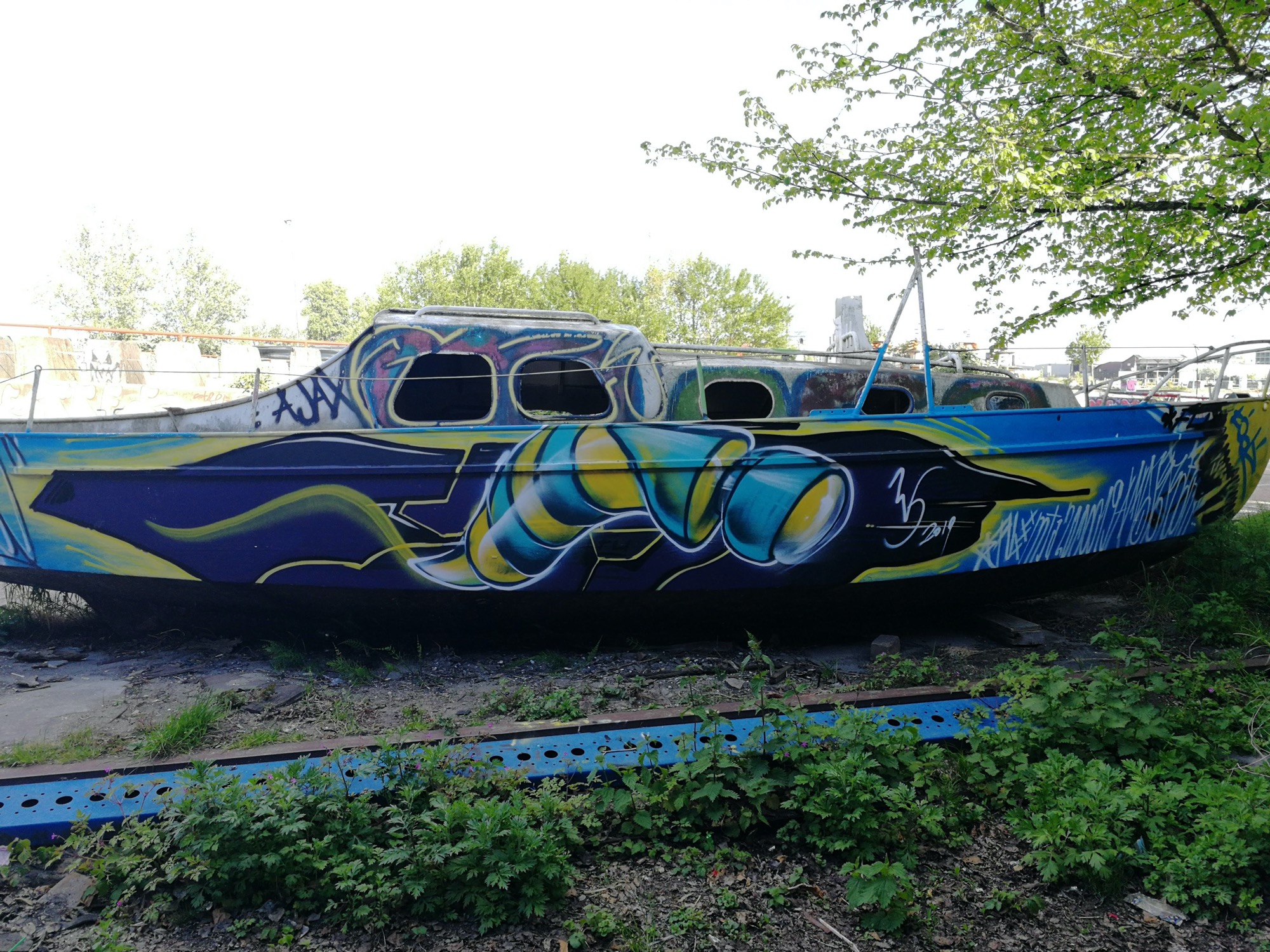 The artwork is of graffiti type. You can admire it in the city of Amsterdam in Netherlands and more precisely here : NDSM-Plein 86a, 1033 WB Amsterdam, Pays-Bas.