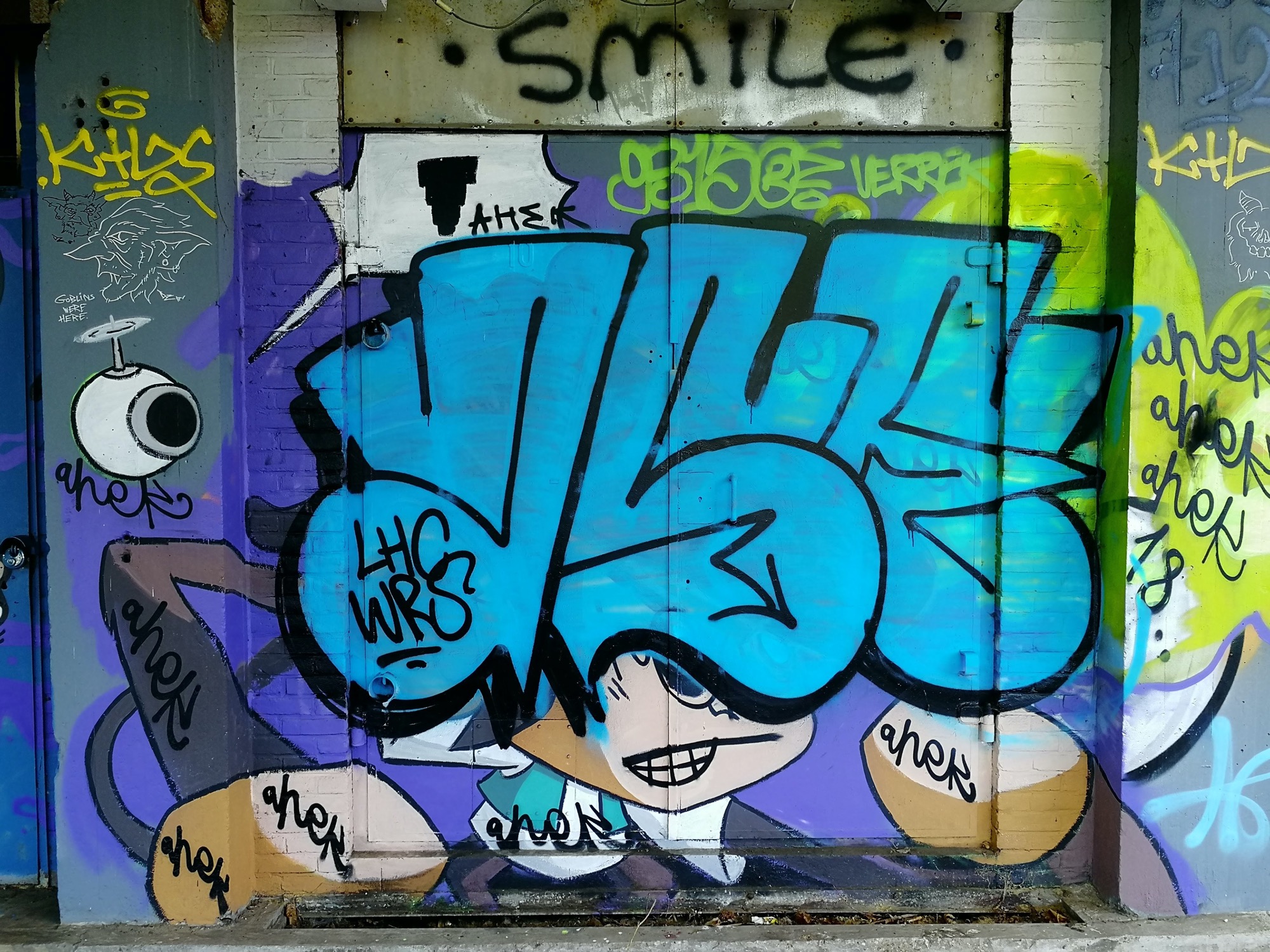 The artwork is of graffiti type. You can admire it in the city of Amsterdam in Netherlands and more precisely here : NDSM-Plein 86a, 1033 WB Amsterdam, Pays-Bas.