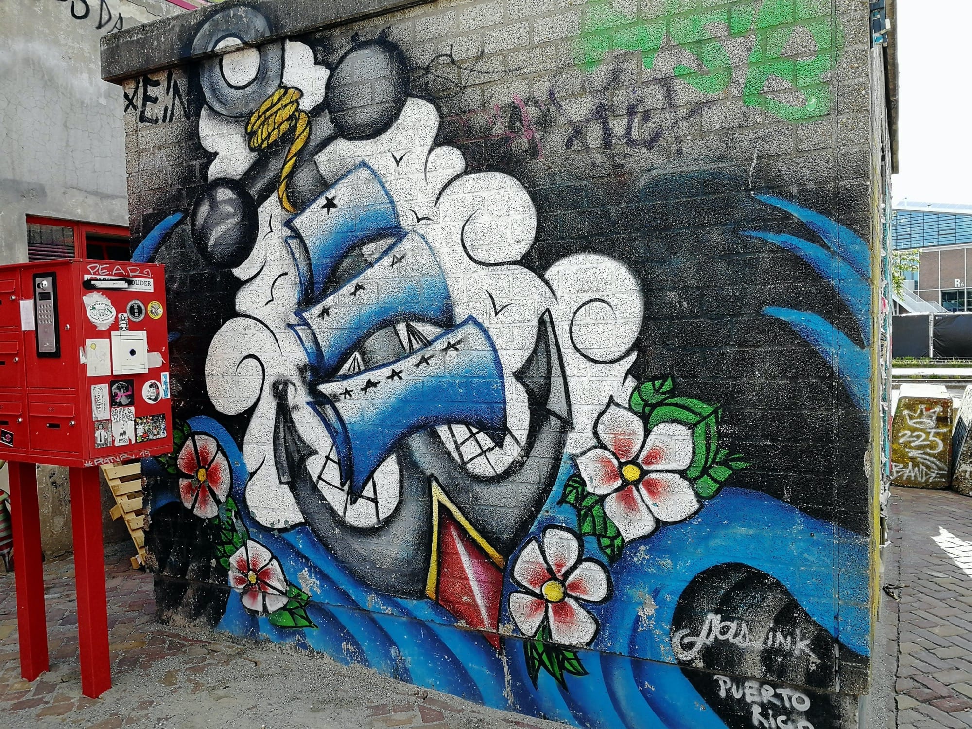 The artwork is of graffiti type. You can admire it in the city of Amsterdam in Netherlands and more precisely here : T.T. Neveritaweg 15D, 1033 WB Amsterdam, Pays-Bas.