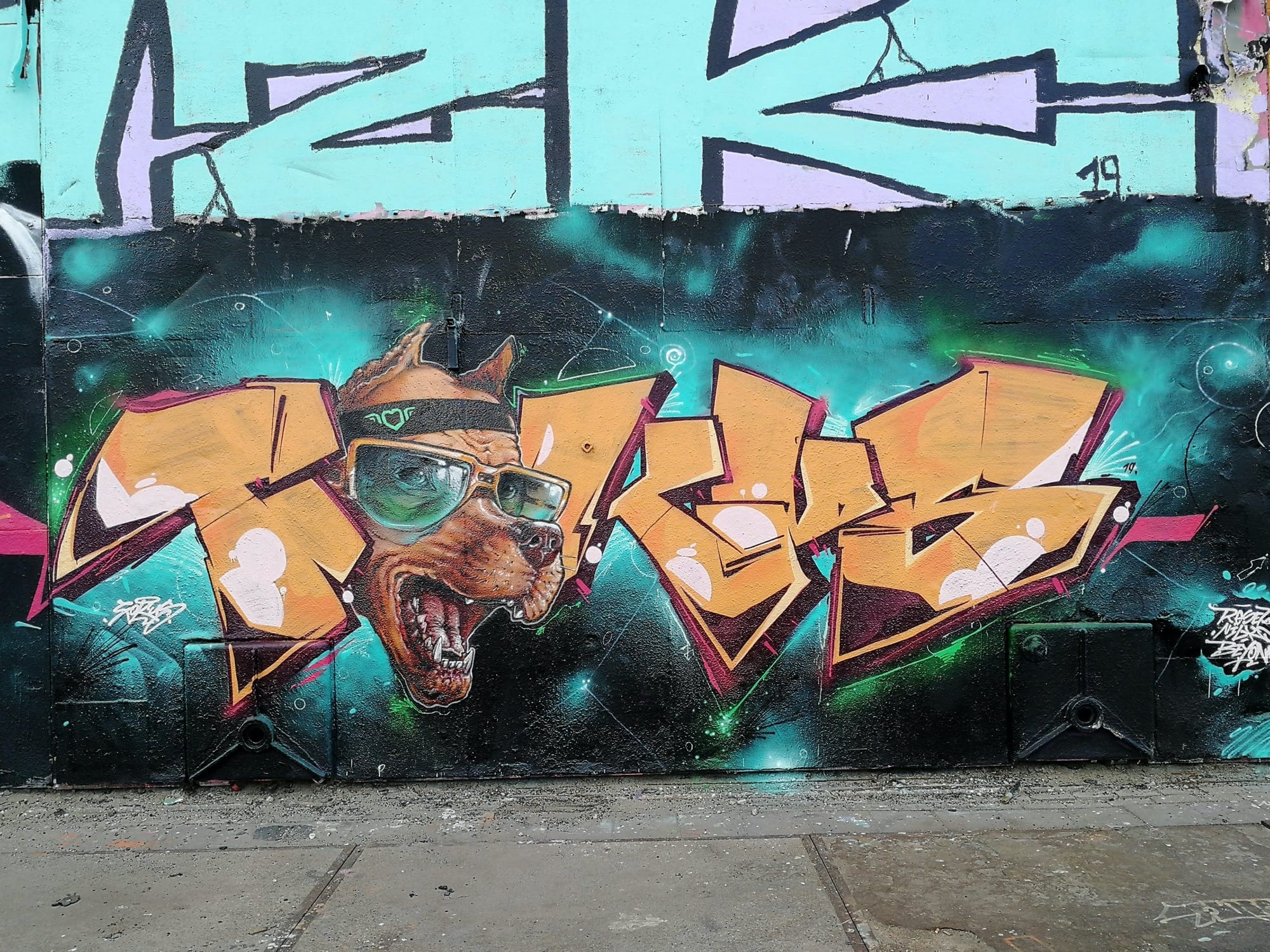 The artwork is of graffiti type. You can admire it in the city of Amsterdam in Netherlands and more precisely here : T.T. Neveritaweg 15, 1033 WB Amsterdam, Pays-Bas.