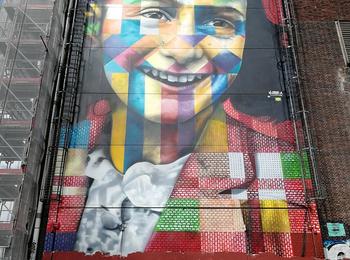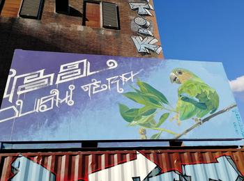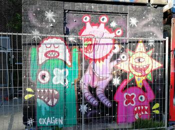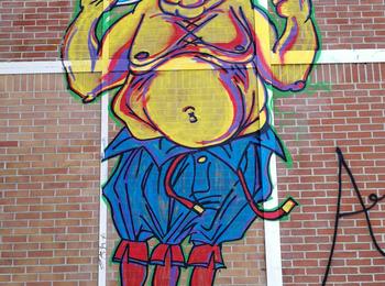 The artwork is of graffiti type. You can admire it in the city of Amsterdam in Netherlands and more precisely here : NDSM-Plein 6, 1033 WB Amsterdam, Pays-Bas.