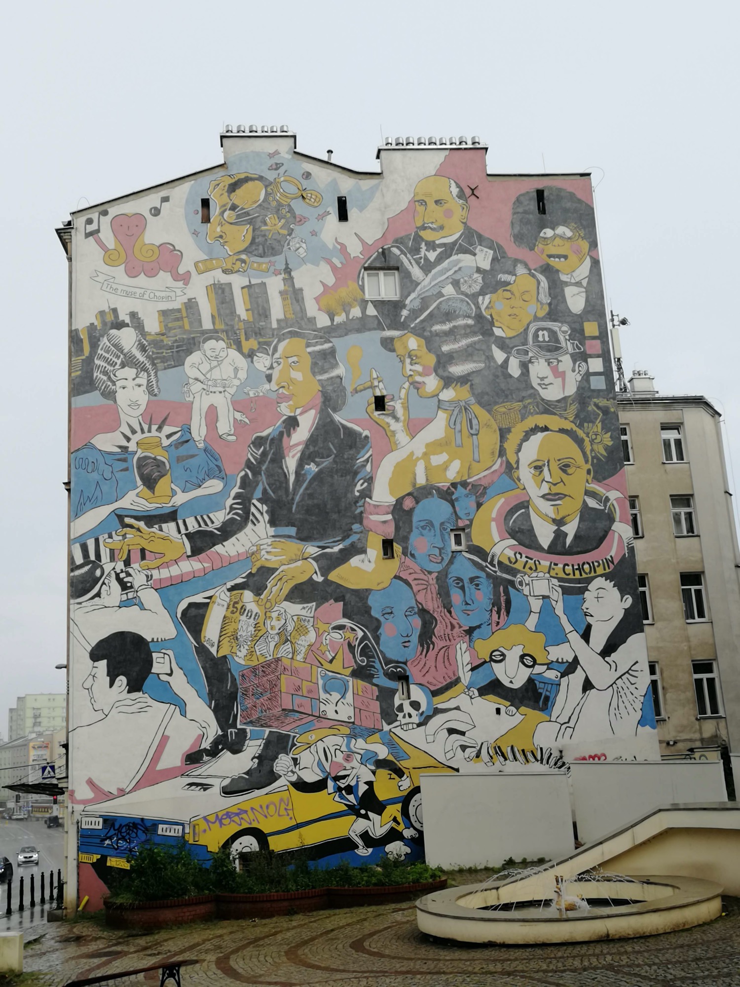 The artwork is of graffiti type. You can admire it in the city of Warszawa in Poland and more precisely here : Tamka 39, 00-355 Warszawa, Pologne.