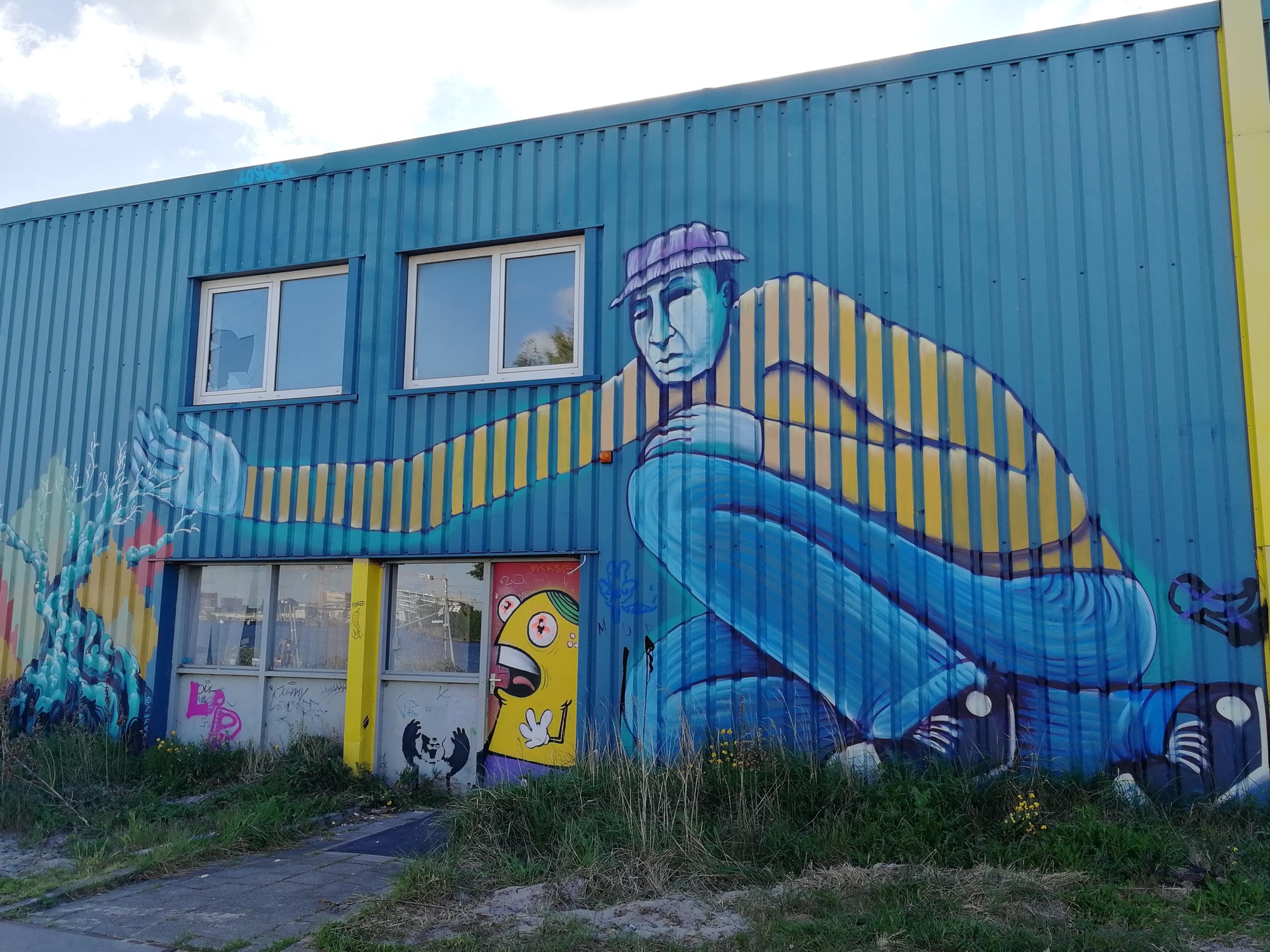 The artwork is of graffiti type. You can admire it in the city of Amsterdam in Netherlands and more precisely here : T.T. Neveritaweg 61, 1033 WB Amsterdam, Pays-Bas.