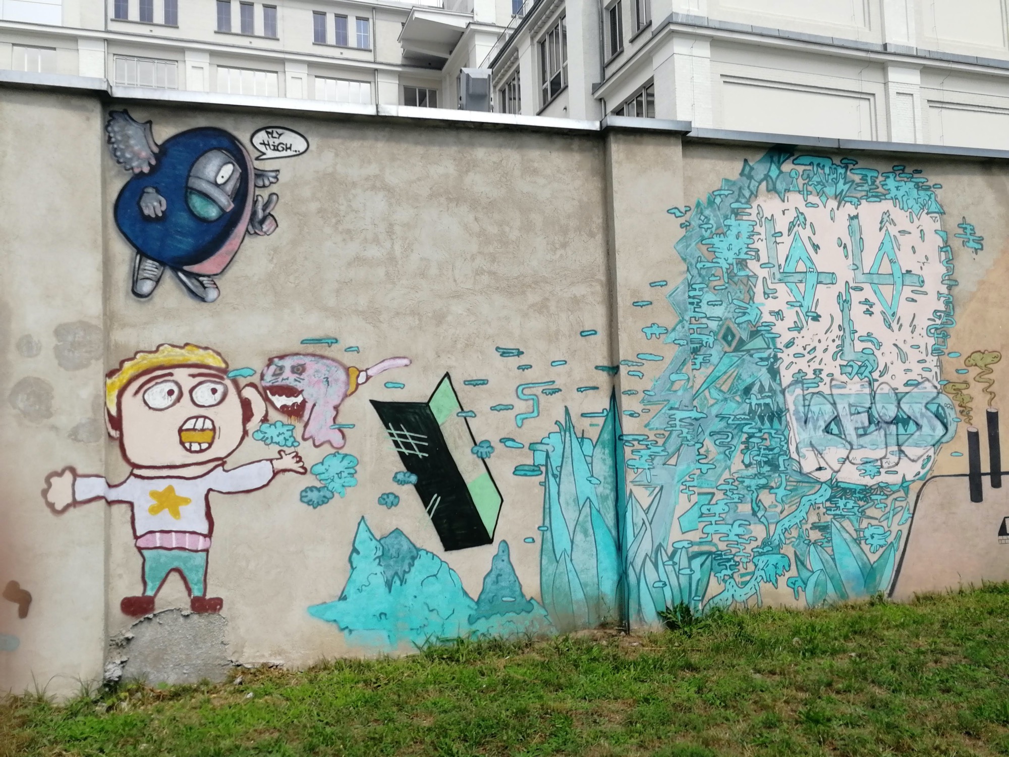 The artwork is of graffiti type. You can admire it in the city of Warszawa in Poland and more precisely here : aleja Wedla, 03-822 Warszawa, Pologne.