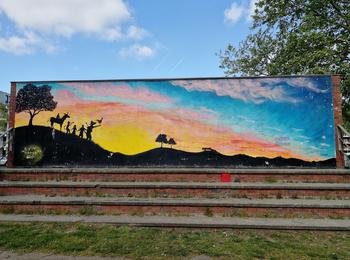 The artwork is of graffiti type. You can admire it in the city of Amsterdam in Netherlands and more precisely here : Doctor H. Colijnstraat 66, 1067 CH Amsterdam, Pays-Bas.