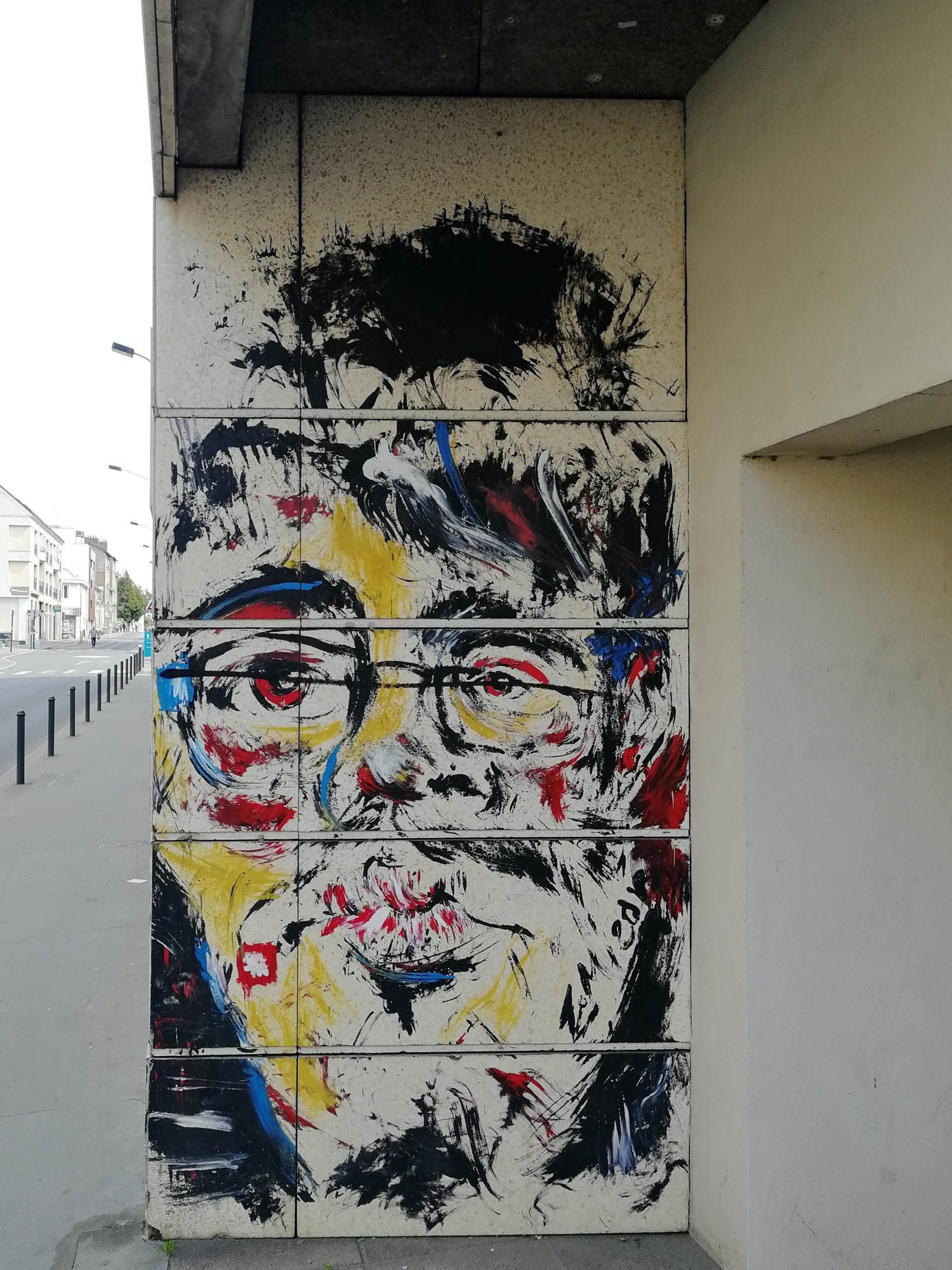 The artwork is of graffiti type. You can admire it in the city of Nantes in France and more precisely here : 21 Rue Pitre Chevalier, 44000 Nantes, France.