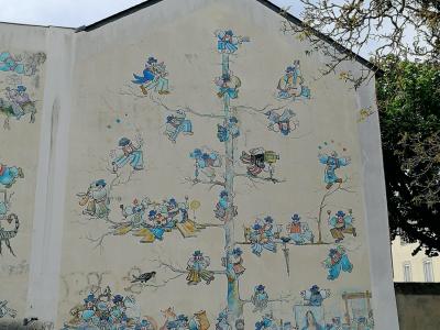 The artwork is of type graffiti. You can admire it in the city of Nantes in France, more precisely here: 78 Rue des Forges, 44300 Nantes, France.