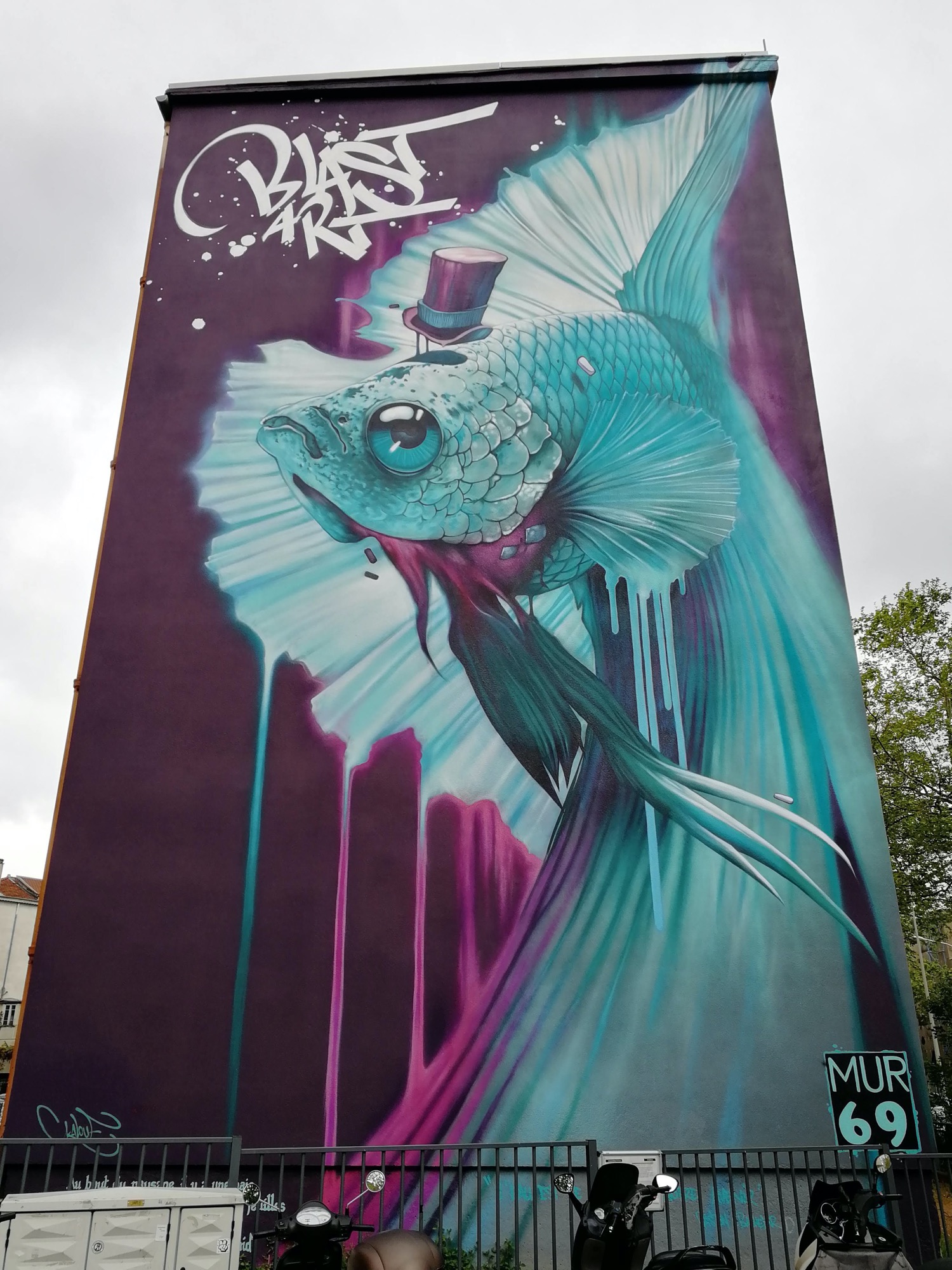 The artwork Le combattant is of graffiti type. You can admire it in the city of Lyon in France and more precisely here : 4 Place des Tapis, 69004 Lyon, France.