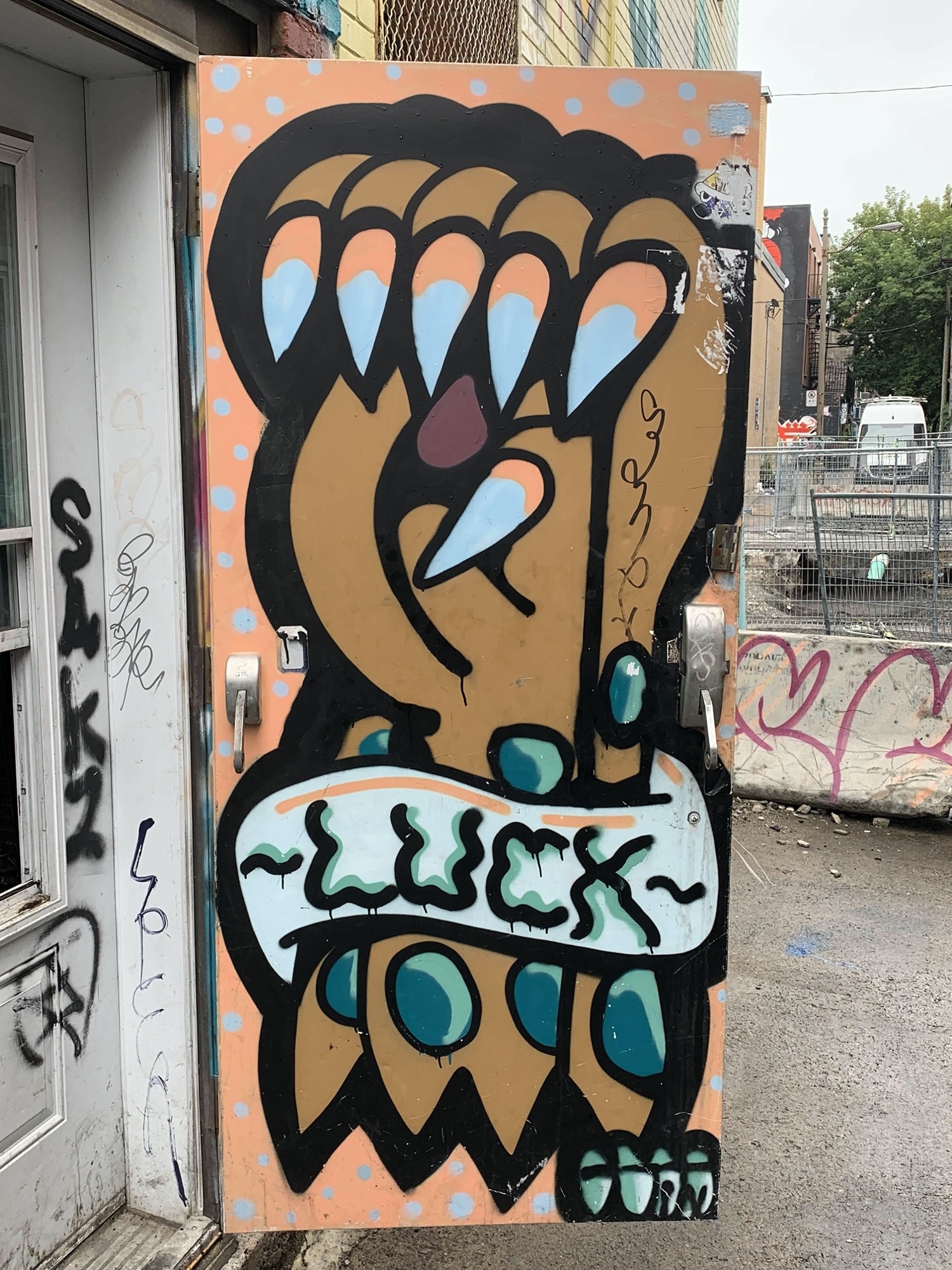 The artwork is of graffiti type. You can admire it in the city of Montréal in Canada and more precisely here : 17 Rue Saint Cuthbert, Montréal, QC H2W 1L2, Canada.