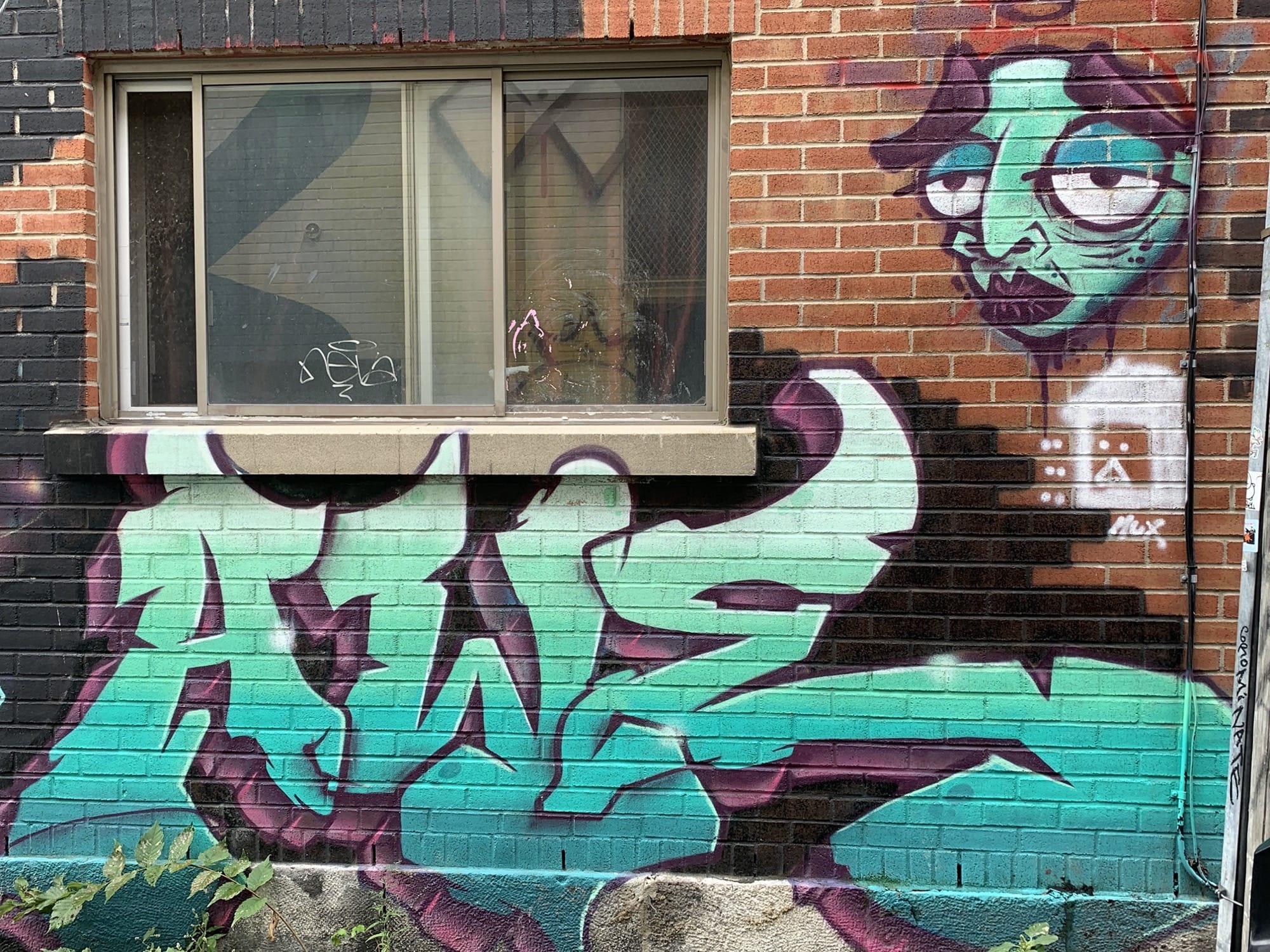 The artwork is of graffiti type. You can admire it in the city of Montréal in Canada and more precisely here : 17 Rue Saint Cuthbert, Montréal, QC H2W 1L2, Canada.